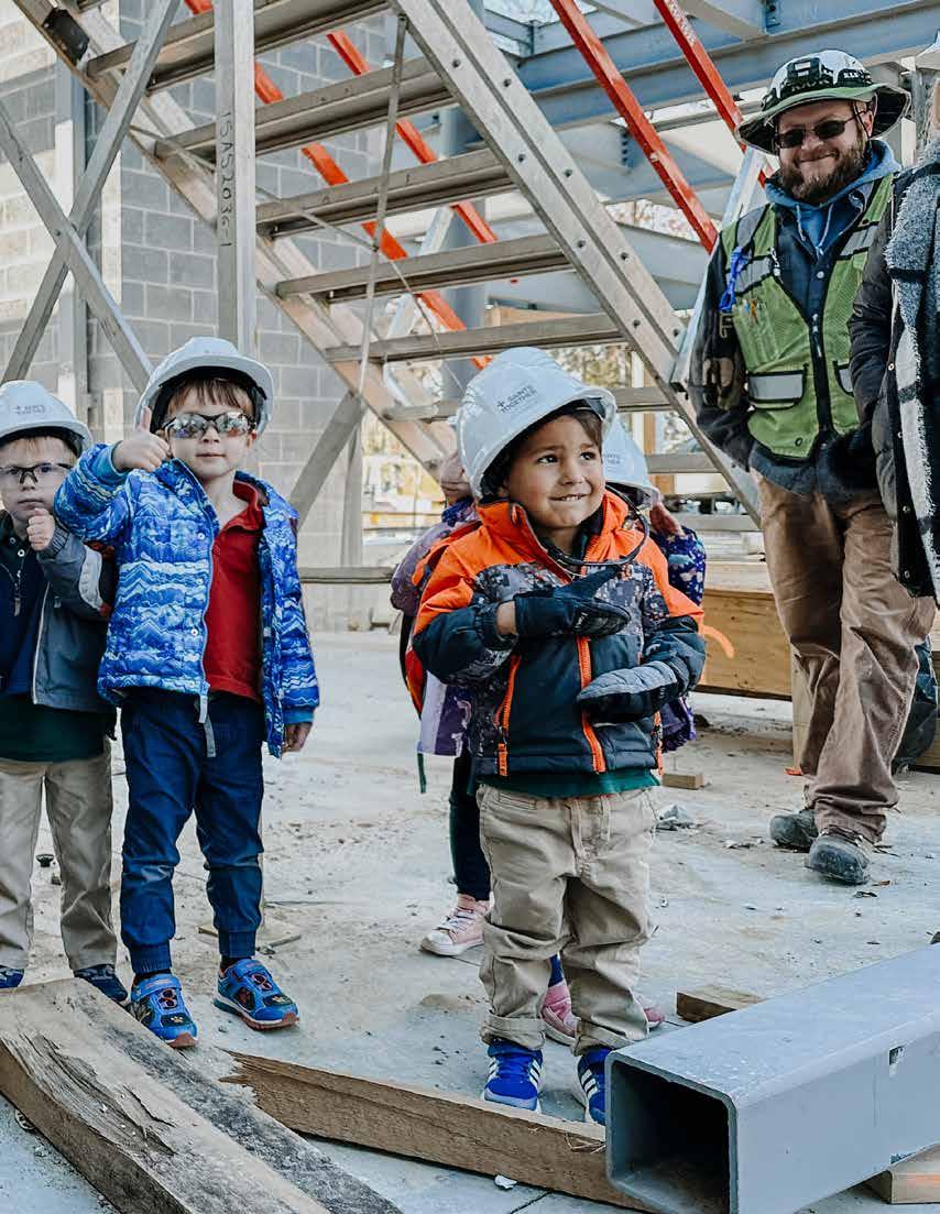 In December our Early Saints (age 3) visited the construction site at the Upper School as part of their unit on architecture. The trip provided a real-world perspective on architecture in action, construction, and the planning process, as well as a unique opportunity to connect to the greater SSSAS community. Our littlest Saints put on their goggles and hardhats to walk through the site, see heavy machinery, and look at blueprints and 3D models. They were excited to take on the role of a construction worker and see everything they have learned about firsthand. One Early Saint even said, “The crane looks like the Washington Monument!” Read more about Saints Together: Our Campaign for Community on p. 8. Photo by Lower School Early Saints Teacher Kat Moore.