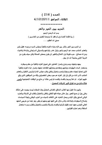 العدد ) ( 216 الثلاثاء الموافق 4/10/2011 ============= الحرب بين الخير والشر بسم ال الرحمن الرحيم