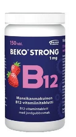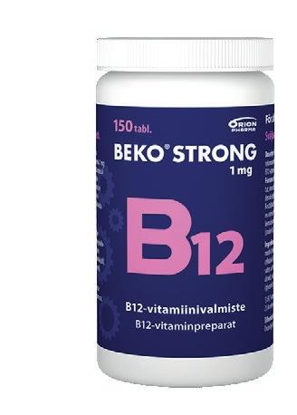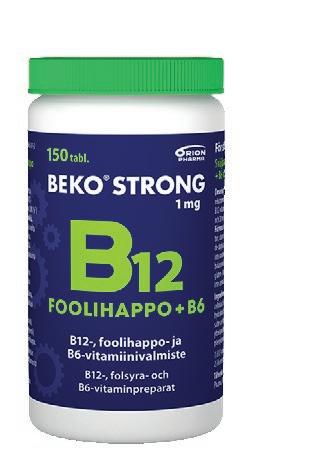 Beko ® Strong B12 1 mg -valmisteista on tarjolla foolihapoton vaihtoehto sekä valmiste, joka sisältää B12-vitamiinin lisäksi 400 mikrogrammaa foolihappoa ja 20 milligrammaa B6-vitamiinia. Foolihapollista valmistetta voi suositella erityisesti ikääntyville.