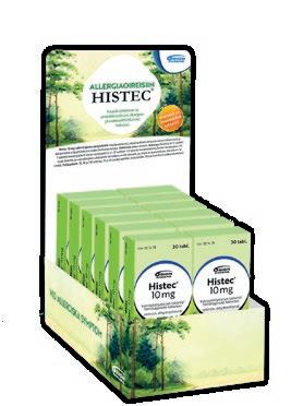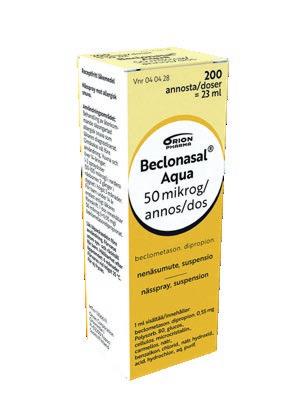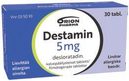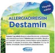 Histec® 10 mg tabletti ja imeskelytabletti. Kausiluonteiseen ja ympärivuotiseen allergiseen nuhaan liittyviin nenä- ja silmäoireisiin sekä pitkäaikaisen nokkosihottuman hoitoon. Vaikuttava aine: setiritsiini. Annostus: Aikuiset ja yli 12-vuotiaat: 1 tabletti/imeskelytabletti kerran vuorokaudessa. 6–12-vuotiaat: 1/2 tablettia/imeskelytablettia 2 kertaa vuorokaudessa. Älä käytä lääkettä, jos olet allerginen setiritsiinille tai lääkkeen muille aineosille, jos sinulla on munuaissairaus, olet raskaana tai imetät. Pakkaukset: 10, 30 ja 100 tablettia, 14 ja 28 imeskelytablettia. Destamin® 5 mg tabletti allergiseen nuhaan liittyviin nenä- ja silmäoireiden sekä nokkosihottuman hoitoon. Vaikuttava aine desloratadiini. Aikuisille ja yli 12-vuotiaille 1 tabletti päivässä. Varmista lääkkeen sopivuus lääkäriltä tai apteekista. Ei raskauden tai imetyksen aikana. Pakkaukset: 10, 30 ja 100 tablettia. Mometason Orion 50 mikrog/annos nenäsumute. Aikuisille (yli 18 v.) siitepölynuhan hoitoon. Vaikuttava aine: mometasonifuroaatti. Annostus: Suositeltu annos on kaksi suihketta kumpaankin sieraimeen kerran vuorokaudessa. Jos et ala tuntea oloasi paremmaksi 7 päivän kuluessa, käänny lääkärin puoleen. Mometason Orion -nenäsumutetta ei saa käyttää yhtäjaksoisesti kolmea kuukautta kauempaa ilman lääkärin määräystä. Kysy lääkkeen käytöstä lääkäriltäsi, jos olet raskaana tai imetät. Pakkauskoko: 1 pullo, jossa on 140 annosta. Beclonasal® Aqua 50 mikrog/annos nenäsumute. Uusiutuvaan kausiluonteiseen allergiseen nuhaan, jonka lääkäri on aiemmin todennut. Vaikuttava aine: beklometasoni. Annostus: Aikuisille ja yli 14-vuotiaille: 1–2 suihketta molempiin sieraimiin kahdesti vuorokaudessa, enintään 3 kuukauden ajan. Enimmäisannos 4 sumutusta/sierain/vrk. Jos oireet eivät merkittävästi lievity, valmisteen käyttöä ei tule jatkaa yli 3 viikkoa. Alle 14-vuotiaille vain lääkärin ohjeen mukaan. Kysy käytöstä lääkäriltä, jos olet raskaana tai imetät. Pakkaus: 23 ml (200 annosta). Kyypakkaus 50 mg tabletti. Ensiavuksi käärmeenpuremaan sekä mehiläisen tai ampiaisen piston aiheuttamiin reaktioihin. Noudata käyttöohjetta ja ota aina yhteys lääkäriin kyynpureman jälkeen. Vaikuttava aine: hydrokortisoni. Pakkauskoko: 3 tablettia. Tutustu huolellisesti itsehoitolääkkeiden pakkausselosteisiin. Histec, Destamin ja Beclonasal ovat Orion Oyj:n rekisteröityjä tavaramerkkejä.