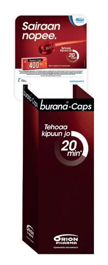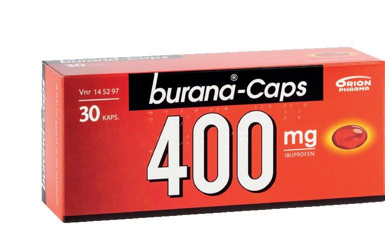 Burana®-Caps 400 mg – Lääkeaine on valmiiksi liuenneessa muodossa, minkä ansiosta se imeytyy nopeasti ja terapeuttinen pitoisuus saavutetaan jo 20 minuutissa. – Sopii myös migreenin ensioireisiin. 10 kaps., tmh 2,60 €, VNR 591230, 20 kpl/tukkupakkaus