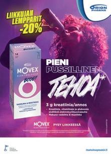 * Kreatiini parantaa fyysistä suorituskykyä peräkkäisissä lyhytkestoisissa ja korkeatehoisissa harjoituksissa. Edullinen vaikutus saavutetaan nauttimalla päivittäin 3 g kreatiinia. Movex on Orion Oyj:n tavaramerkki.
