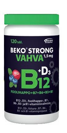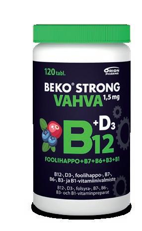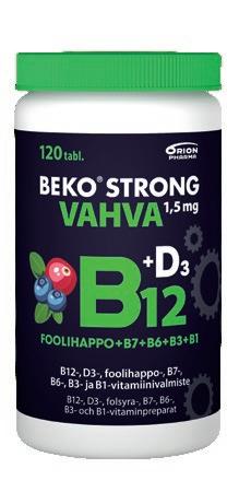 Beko® Strong B12 VAHVA 1,5 mg on monipuolinen ja markkinoiden vahvin B12-vitamiinitabletti. Beko Strong B12 VAHVA 1,5 mg -valmisteet on kehitetty erityisesti muistin ja hermoston1, vastustuskyvyn2 sekä jaksamisen3 tueksi. B12-vitamiini edistää normaaleja psykologisia toimintoja, kuten muistin toimintaa. B12-vitamiini vähentää