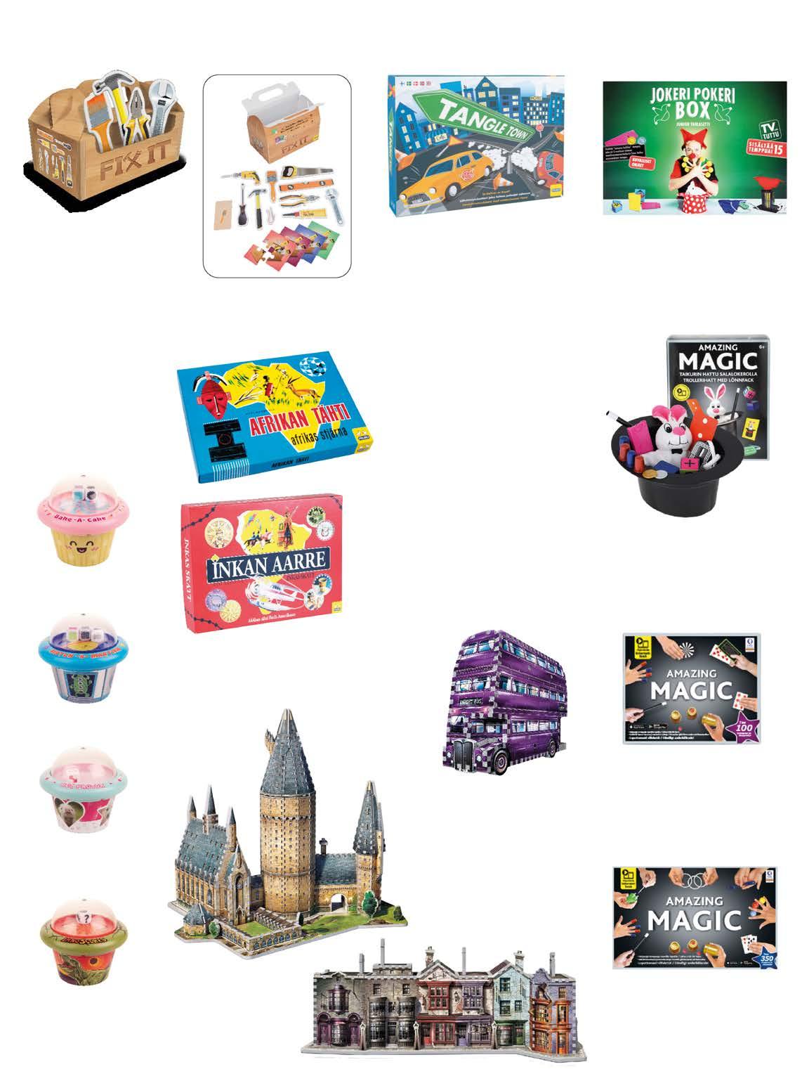 Seuraa somessa 157 Joulusatu 160 K-Citymarket 278 KidZone 287 Kärkkäinen 284 Leluhyrrä 105 Lelukirja verkossa............................................ 243 Leluyhdistys 268 Oikeat Lelukaupat.............................................274 Pulu piparin perässä 228 Puuhastelua: Väritä kuva 47 Puuhastelua: Etsi erot...................................103 Puuhastelua: Etsi oikea varjo 104 Puuhastelua: Ristikko 120 Muumi-pelit 212 National Geographic 204 Oppi ja ilo 224 Peliko-pelit ............................................................. 208 Ravensburger-pelit 216 Reaxion 187 Rubiks Cube 206 SmartGames 220 Star Wars 202 Super Mario 223 Tatu ja Patu -pelit ............................................... 213 Toyrock Pelit 190 Trefl 226 WOW! 227 Wrebbit 209 Askartelu ja taide Antibacterial Dough/Slime ......................... 230 Aquabeads 238 CreArt....................................................................... 237 Dino World 240 Dissect it 236 Dr. Squish 230 HAMA 232 Mad Mattr .............................................................234 Make it Real 242 Play-Doh ................................................................. 231 Real Littles 239 Spirograph 235 TOPModel 241 Ylvi 240 Taaperot Baby Shark 260 BB Junior 260 bo. ................................................................................ 262 BRIO Toddler 261 Clementoni Baby...............................................251 Hape 253 Headu........................................................................264 Fisher-Price 246 Fisher-Price Little People 250 Lamaze ..................................................................... 254 LEGO Dublo 256 Moluk ........................................................................ 258 Muumi 252 Quercetti 259 Vikingtoys 259 Vtech 255 33 Huomio! Hinnat ovat