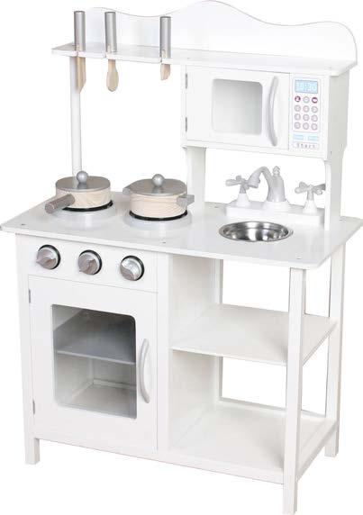 Nuput valkoinen leikkikeittiö Pikkukokin unelma keittiössä on hella, uuni, mikroaaltouuni, tiskiallas, keittiötarvikkeita ja muita hienoja yksityiskohtia.