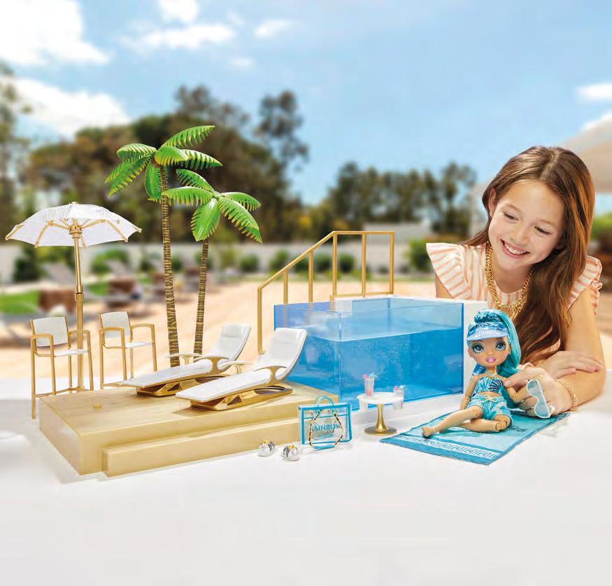 Rainbow High nukkejen upea rantaklubi leikkisetti, jonka uima-altaassa vaihtuvat sateenkaaren värit valotoiminnolla. Upea paikka pitää kesäjuhlat. Mukana tulee palmut, rantatuolit, päivänvarjo ja paljon muita tarvikkeita. Pakkaus ei sisällä nukkeja. 5+.