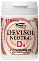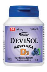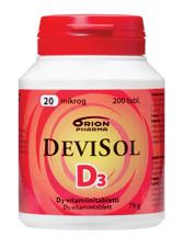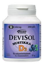 D-vitamiinivalmiste. Vaihtoehtoina nieltävä tabletti ja sitruksen- tai mustikanmakuinen imeskeltävä tabletti.