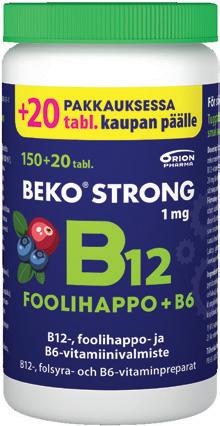 *B12-, B6-vitamiini sekä foolihappo edistävät normaaleja psykologisia toimintoja, immuunijärjestelmän normaalia toimintaa sekä vähentävät väsymystä ja uupumusta. B6-ja B12-vitamiinit edistävät hermoston normaalia toimintaa. Vegaaninen. RAVINTOLISÄ. Tarjous koskee seuraavia valmisteita: Beko Strong B12+foolihappo+B6 mustikka-karpalo purutabletti ja nieltävä tabletti 150+20 tabl. Tarjous voimassa lokakuun ajan.