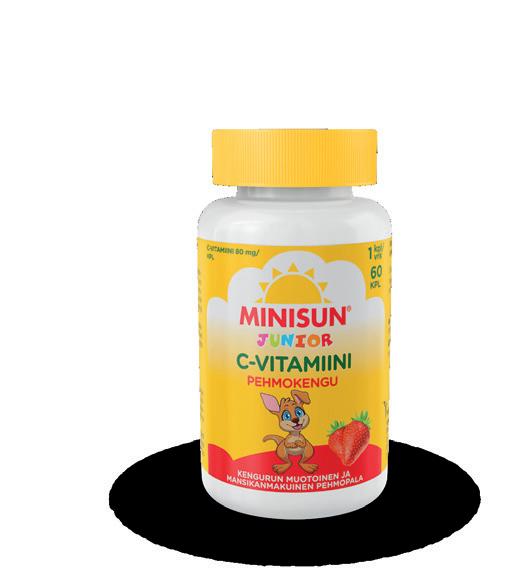 Minisun C-vitamiini Pehmokengu on mansikanmakuinen ja kengurun muotoinen pehmeä ja pureskeltava C-vitamiinivalmiste. Yksi pehmo sisältää 80 mg C-vitamiinia. Tuote on makeutettu hammasystävällisellä maltitolilla ja se sisältää vain luontaisia värejä ja aromeja. Pakkauskoot 60 kpl ja 120 kpl. (Saatavilla apteekista lokakuun aikana.)