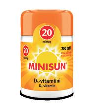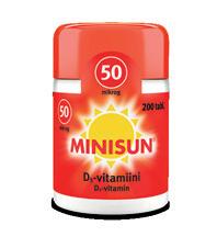 D-vitamiinivalmiste. Vaihtoehtoina nieltävä tabletti ja sitruksen tai mustikan makuinen imeskeltävä tabletti.