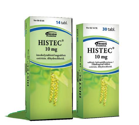 Histec 10 mg tabletti ja imeskelytabletti. Kausiluonteiseen ja ympärivuotiseen allergiseen nuhaan liittyviin nenä- ja silmäoireisiin sekä pitkäaikaisen nokkosihottuman hoitoon. Vaikuttava aine: setiritsiini. Annostus: Aikuiset ja yli 12-vuotiaat: 1 tabletti/imeskelytabletti kerran vuorokaudessa. 6–12 vuotiaat: 1/2 tablettia/imeskelytablettia 2 kertaa vuorokaudessa. Kysy Histecin käytöstä lääkäriltäsi, jos sinulla on munuaissairaus tai olet raskaana tai imetät. Pakkaukset: 10, 30 ja 100 tablettia, 14 ja 28 imeskelytablettia. Itsehoitolääke. Tutustu huolellisesti pakkausselosteeseen.