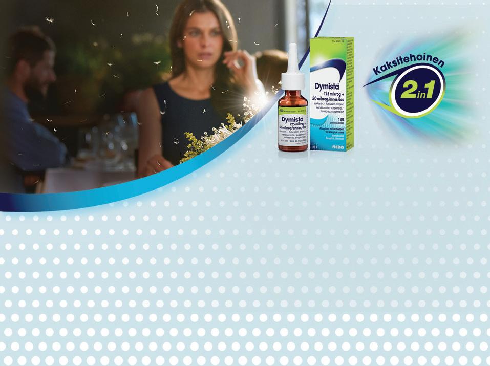 Dymista 125 mikrogrammaa + 50 mikrogrammaa / annos nenäsumute, suspensio on tarkoitettu aikuisille keskivaikean tai vaikean kausiluonteisen allergisen nuhan oireiden lievittämiseen, kun hoito nenän kautta otettavalla antihistamiinilla tai glukokortikoidilla ei riitä. Vaikuttavat aineet: atselastiinihydrokloridi + flutikasonipropionaatti. Yksi suihke kumpaankin sieraimeen aamuin illoin. Otettava yhteyttä lääkäriin, jollei olo parane kahden viikon jälkeen tai se huononee. Varmista nenäsumutteen oikea käyttötapa pakkausselosteesta. Dymista-valmistetta saa käyttää raskauden ja imetyksen aikana vain lääkärin määräyksellä. Tutustu huolella pakkausselosteeseen. Saatavana vain apteekista. Markkinoija Viatris Oy. (22.6.2022)