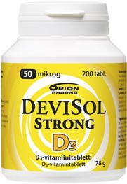 Vahva D3-vitamiinivalmiste. Vaihtoehtoina nieltävä tabletti ja sitruksen tai mustikan makuinen imeskeltävä tabletti.