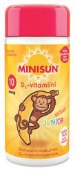 D3-vitamiinivalmiste. Vaihtoehtoina nieltävä tabletti ja sitruksen tai mustikan makuinen imeskeltävä tabletti.
