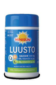 Vahva luusto on monen elämäntavan- ja perintötekijän summa. Luuston rakentamisessa tarvitaan kalsiumin ja D-vitamiinin lisäksi myös K-vitamiinia. K-vitamiini auttaa kalsiumia kiinnittymään luustoon ja tukee luuston terveyttä.* Monipuolisesta Minisun Luusto -sarjasta löydät Kalsium + D3-vitamiinituotteiden lisäksi myös vahvan ja ainutlaatuisen yhdistelmävalmisteen kalsiumia, D3-, ja K2-vitamiineja, jotka edistävät luiden pysymistä normaaleina.*