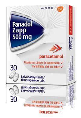 PANADOL ZAPP 500 mg tabletti, kalvopäällysteinen Vaikuttava aine parasetamoli. Särky- ja kuumetilojen oireenmukainen hoito. Aikuisille ja yli 18-vuotiaille nuorille: 1–2 tablettia korkeintaan 3 kertaa vuorokaudessa. Ei suositella alle 18-vuotiaille lapsille ja nuorille. Yli kolmen päivän yhtäjaksoiseen käyttöön vain lääkärin määräyksellä. Annosvälin tulee olla vähintään 4 tuntia. Annosteluohjetta ei saa ylittää. Älä käytä Panadol Zappia, jos olet allerginen parasetamolille tai muille aineosille. Sisältää parasetamolia. Muita parasetamolia sisältäviä valmisteita tai muita särkylääkkeitä ei saa käyttää samanaikaisesti. Sisältää natriumia. Panadol Zapp -valmistetta voi käyttää raskauden aikana. Sinun tulisi käyttää mahdollisimman pientä annosta, joka vähentää kipua ja/tai kuumetta ja käyttää sitä mahdollisimman lyhyen aikaa. Lue pakkausseloste. Itsehoitolääke. Valmisteyhteenvetolyhennelmä 22.11.2022. Perustuu 26.4.2022 päivättyyn valmisteyhteenvetoon. Pakkauskoot: 10 tabl. ja 30 tabl. Korvattavuus: Ei korvattava itsehoitolääke. Lisätiedot: Haleon Finland Oy, Energiakuja 3, 00180 Helsinki, puh: 010 341 77 00, s-posti: mystory.nd@haleon.com. Tavaramerkit ovat Haleon-konsernin omistamia tai sille lisensoituja. ©2023 Haleon-konserni tai lisenssinhaltija. 02/2022, PM-FI-PAN-22-00012