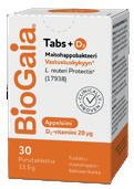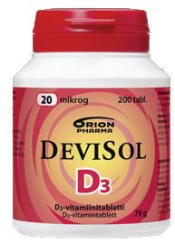 D-vitamiinivalmiste. Vaihtoehtoina nieltävä tabletti ja sitruksen tai mustikan makuinen imeskeltävä tabletti.