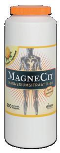 Hyvin imeytyvä magnesiumsitraatti ja B6-vitamiini samassa valmisteessa. Vaihtoehtoina nieltävä tai pureskeltava tabletti.