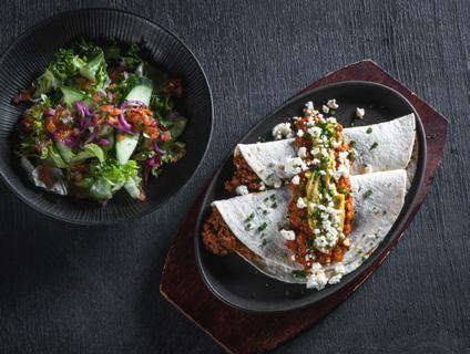 Kahden vehnätortillan päällä Salsa Rojaa, guacamolea, Queso Frescoa, ruohosipulia. Tortillojen välissä valitsemasi täyte (Chili con Carne (PG) Chili con Vege (PG, PV) Ylikypsä porsaankylki (PG)). Annos tarjoillaan salaatin kera.