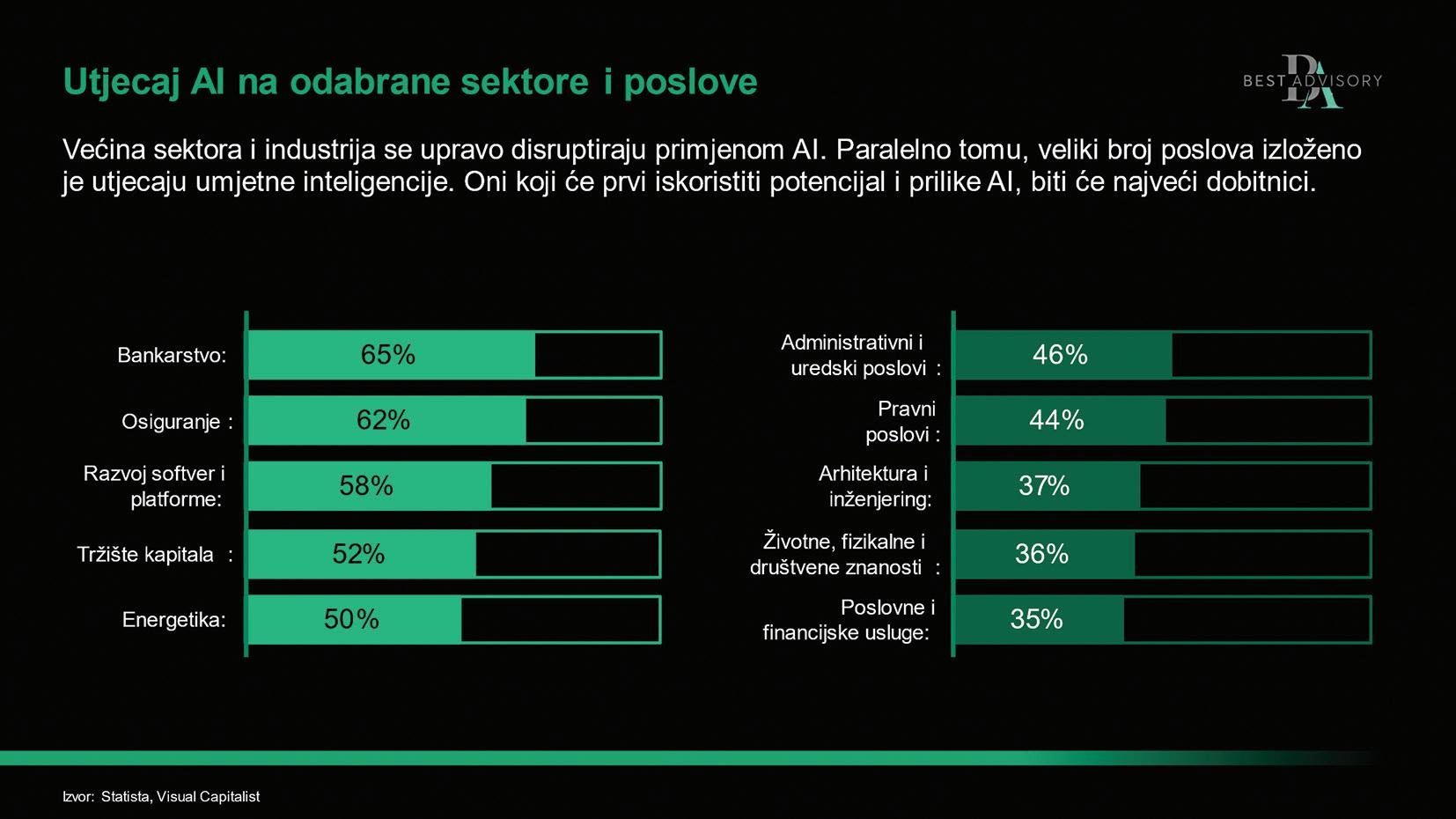 Hrvatska poduzeća sve više koriste AI za optimizaciju poslovnih procesa, od prediktivne analitike u financijama i marketingu do pametnih sustava u proizvodnji. Sektor turizma, ključan za Hrvatsku, također počinje koristiti AI za personalizaciju korisničkog iskustva, analizu podataka i optimizaciju usluga.