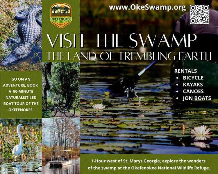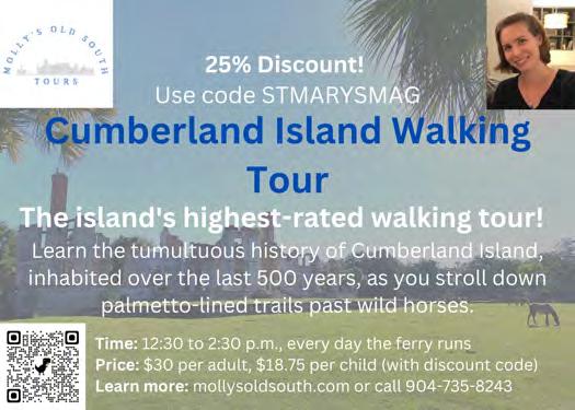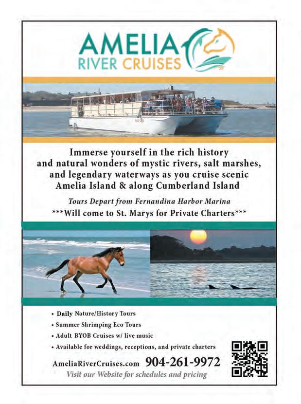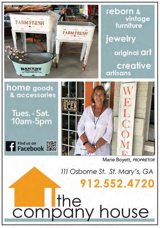 912-673-7694 Miss Julie’s House InDowntown St. Marys Have you enrolled your little ones yet? M-F: 6:30 am - 6:00 pm 501 Osborne Street • St. Marys, GA www.missjulieshouse.com Storied treasures around every corner including beautiful antique furniture, collectibles, rugs, artwork, and great gift items. Downtown St. Marys at 102 West Church Street 912-882-5861 Gallery Featuring 13 Local Artists! • Annie Sloan Chalk Paint® • Miss Mustard Seed’s Milk Paint ® • Classes • Vintage Finds • Local Art 912.510.0639 FIND US ON 711 OSBORNE STREET • ST. MARYS, GA Books are just worlds waiting to be opened. Discover your new worlD at: 207 osborne street • st. Marys, Ga 912.882.7350 onceuponaBookseller.com FinD us on FaceBook Celebrating 27 years in 2023!! St. Marys Submarine Museum Where History Surfaces Every Day ! TUESDAY – SATURDAY: 10:00 AM TO 5:00 PM CLOSED SUNDAYS AND MONDAYS AND MOST MAJOR HOLIDAYS 102 St. Marys Street West • St. Marys, GA 31558 912-882-ASUB (2782) • www.stmaryssubmuseum.com www.StMarysMagazine.com