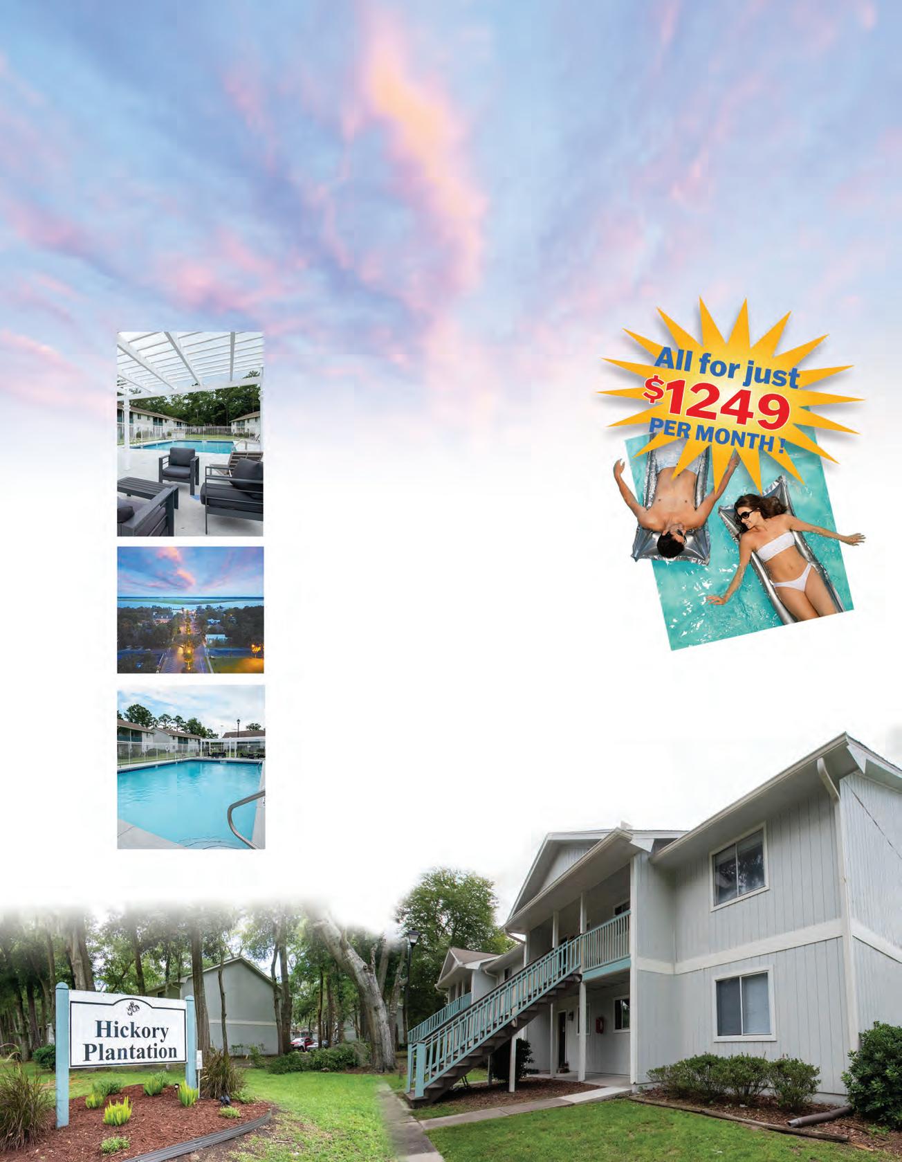 The newly-renovated Hickory Plantation Apartments are the PERFECT choice for those seeking easy living in a storybook setting. Nestled among ancient oaks, Hickory Plantation’s enviable location is within easy walking distance to the enchanting St. Marys’ Waterfront. Hardwood floors, designer cabinets with granite counter tops, pool, picnic and BBQ area enhance your carefree lifestyle. No other downtown property offers this oasis setting and picturesque Low Country architecture. CALL TODAY for special offers and military discount. Carefree Lifestyle. Resort-like Setting. Downtown St. Marys. Why Live Anywhere Else? 912.673.6622 Hickory Plantation 900 DILWORTH STREET ST. MARYS, GA ALL NEWLY RENOVATED! • ALL NEW POOL!