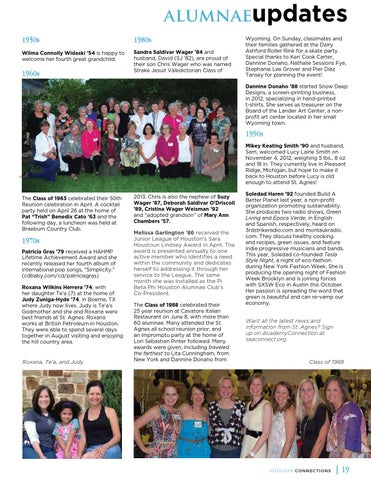 1970s Patricia Gras ’79 received a HAHMP Lifetime Achievement Award and she recently released her fourth album of international pop songs, “Simplicity.” (cdbaby.com/cd/patriciagras) Roxana Wilkins Herrera ’74, with her daughter Te’a (7) at the home of Judy Zuniga-Hyde ’74, in Boerne, TX where Judy now lives. Judy is Te’a’s Godmother and she and Roxana were best friends at St. Agnes. Roxana works at British Petroleum in Houston. They were able to spend several days together in August visiting and enjoying the hill country area.
