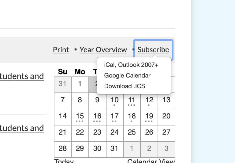 1. Navigate to the events page from the school’s home page. 2. Select the calendar(s) you want to sync. 3. Click “subscribe” and choose your personal calendar application.