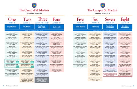 IDEAS FOR OUTDOOR PLAY Don’t lament the fact that your children aren’t playing as much outside as you did at their age. Instead, use the summer months as an opportunity to incorporate more outdoor time into your family’s lifestyle. Keep it fun and lead by example. Try these ideas this summer and rest assured that St. Martin’s will continue to find ways to make the outdoors an integral part of your child’s education. • Tap into their interests. If your daughter loves art, encourage her to take a sketch pad outside. Just because you love to hike doesn’t mean she will. • Try something new. Maybe this is the summer you’ll (finally!) go camping. Or maybe after-dinner tennis on a local court will become your new routine. • Schedule outdoor playdates. Make sure the friend comes prepared for outdoor play with sunscreen, bug spray and old shoes for mud play. • Build an outdoor playspace together then turn it over to the kids. This could be as simple as a teepee made of fallen branches, or an old-school treehouse. • Make sure bikes, scooters, etc. are in good working order and accessible. Broken equipment stuffed into a corner of the garage won’t get much use. • Take indoor activities outside, like meals, reading and writing thank you notes. • Learn more at childrenandnature.org and check out Richard Louv’s books “Last Child in the Woods” and “Vitamin N.”