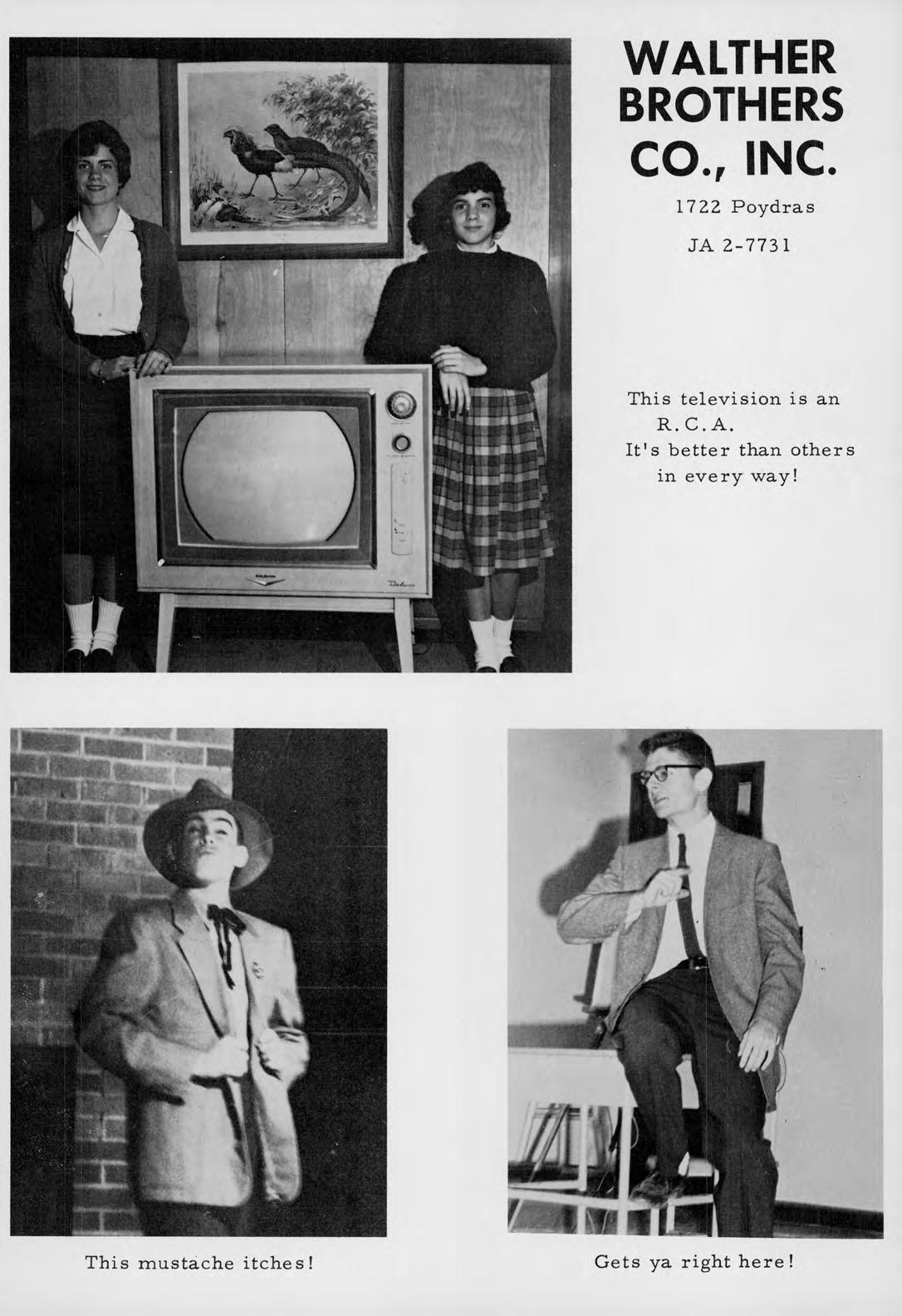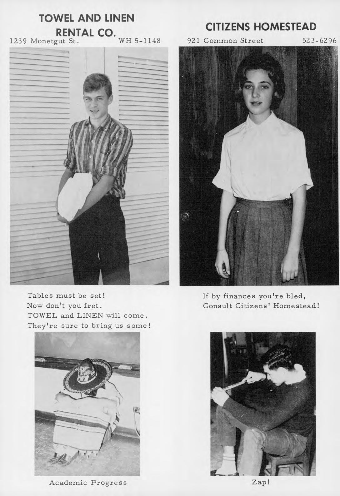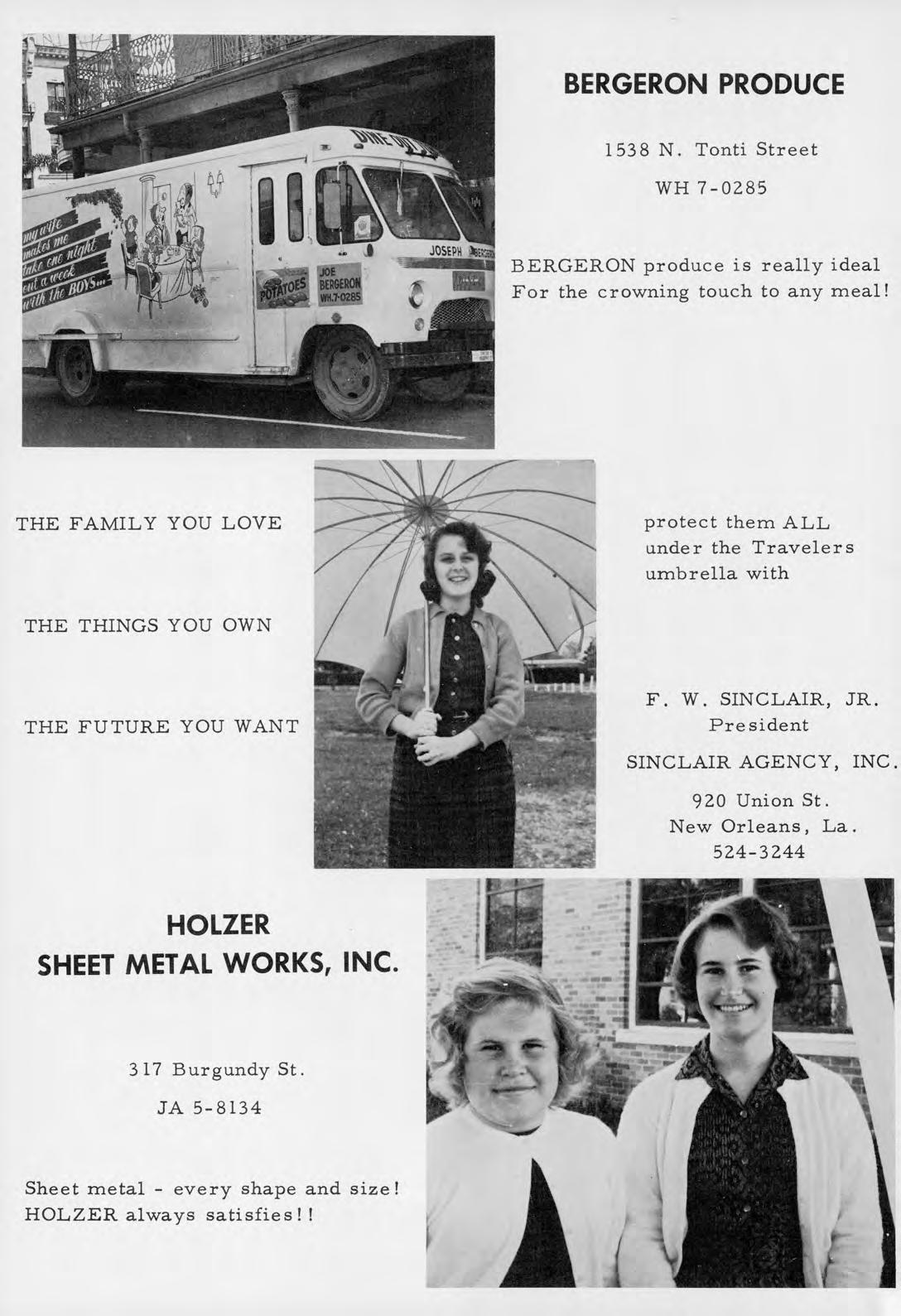 631 Elysian Fields CRESCENT WELDING SUPPLY 21 5th Street, Gretna, La. WH 9-4453 4400 Camel, Metairie, La. On Cresc ent Supply You can rely! 700 Margaret St., Houma, La. ,....,..l'j.WjTr WHITE SYSTEM OF NEW ORLEANS, INC. 343 Carondelet St. JA 2-8201 Get money from WHITE! Set your budget right! ! SCHOOL PRODUCTS COMPANY 2920 Chartres St. WH 4-2468 The desks we get need little repair-They'll take a lot of wear and tear! !