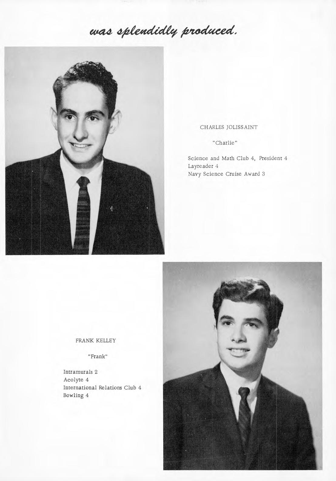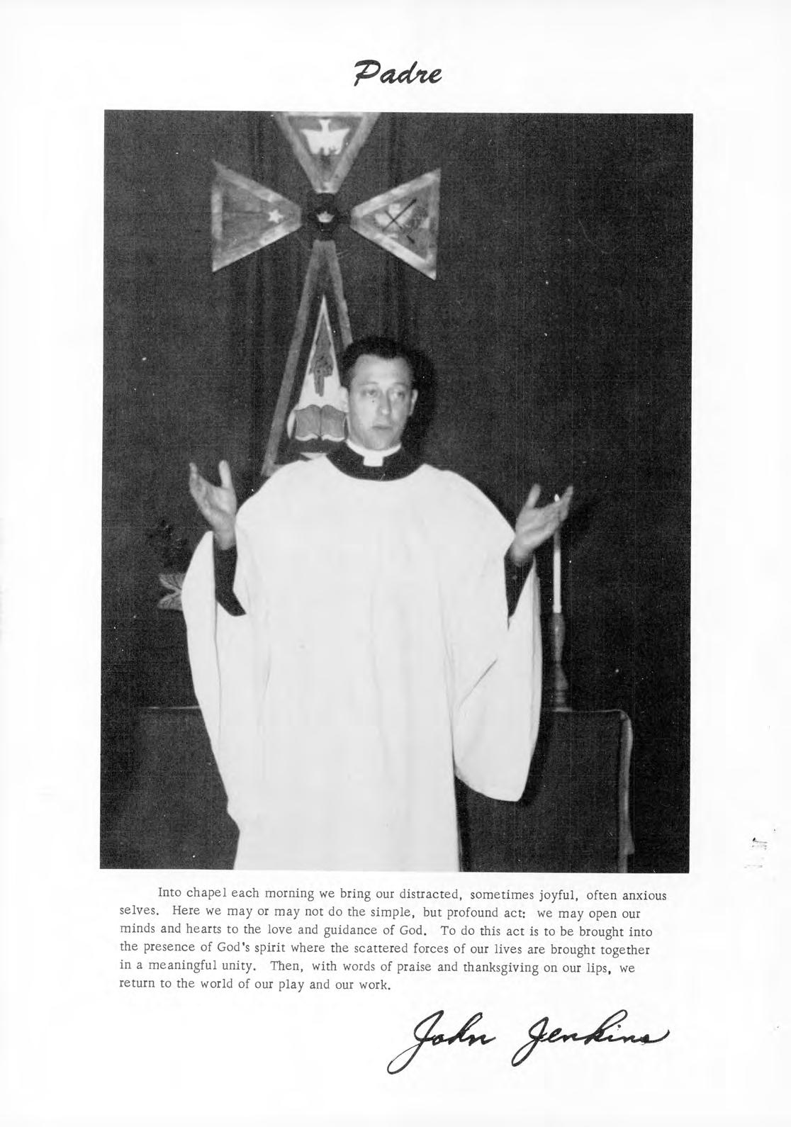 The picture of the school Shield which appears on the cover of this annual, is symbolic of the school's activities during this school year . It is important that we are ever mindful of the great and timeless symbols which characterize the aims, ideals, and aspirations of our school. The American flag which each day proudly waves over our campus and stands beside the altar in chapel is one of these. It forever heralds the freedom and right of each student to develop his talents and intellect to the best of his ability It too is a reminder that each of us must do his best to develop those characteristics which typify the good American.