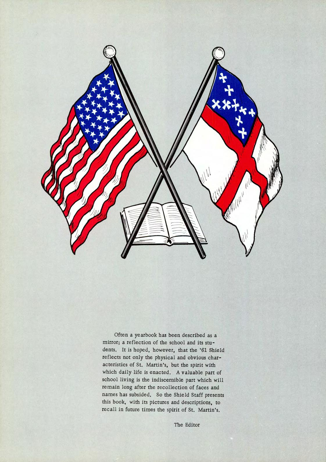 Often a yearbook has been described as a mirror; a reflection of the school and its students. It is hoped, however, that the '61 Shield reflects not only the physical and obvious characteristics of St. Martin's, but the spirit with which daily life is enacted. A valuable part of school living is the indiscernible part which will remain long after the recollection of faces and names has subsided. So the Shield Staff presents this book, with its pictures and descriptions, to recall in future times the spirit of St. Martin's.