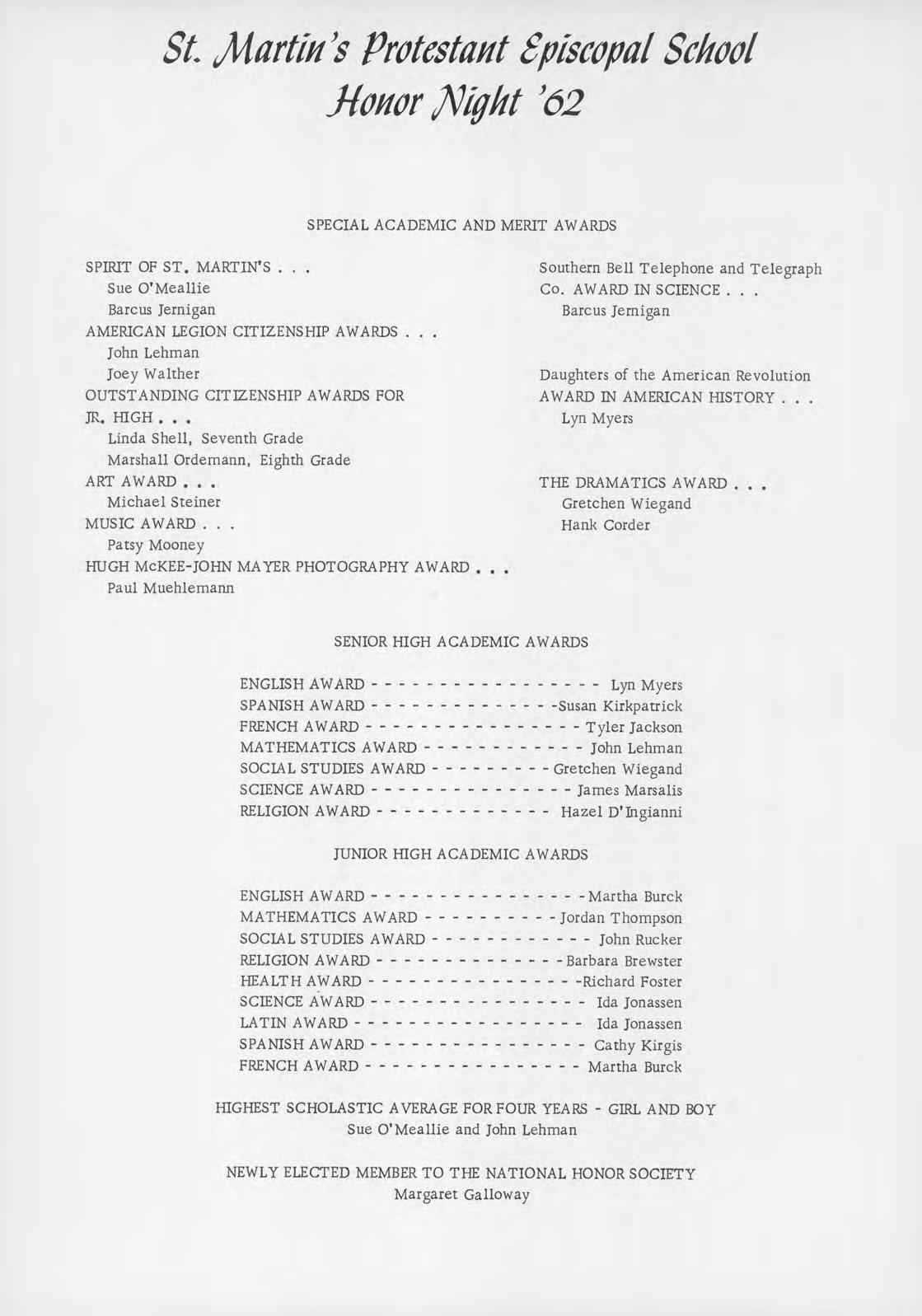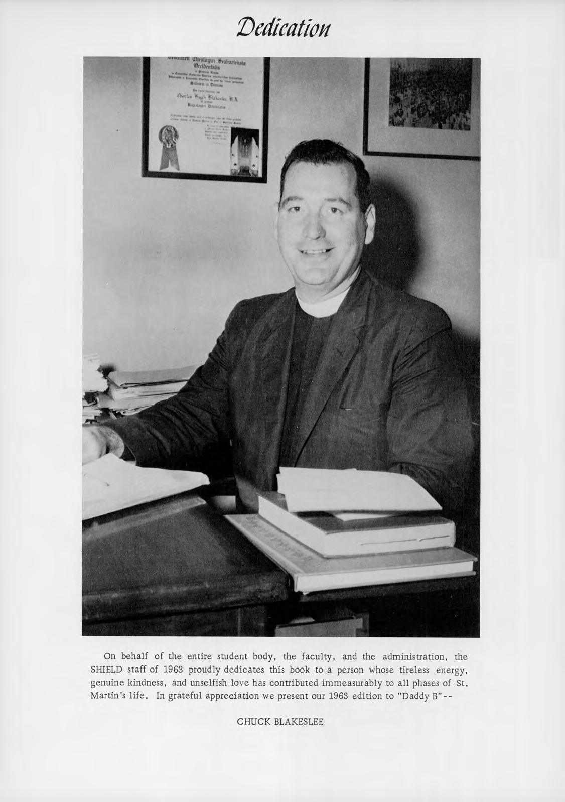 On behalf of the entire student body, the faculty, and the administration, the SHIELD staff of 1963 proudly dedicates this book to a person whose tireless energy, genuine kindness, and unselfish lo ve has contributed immeasurably to all phases of St. Martin's life. In grateful appreciation we present our 1963 edition to "Daddy B"