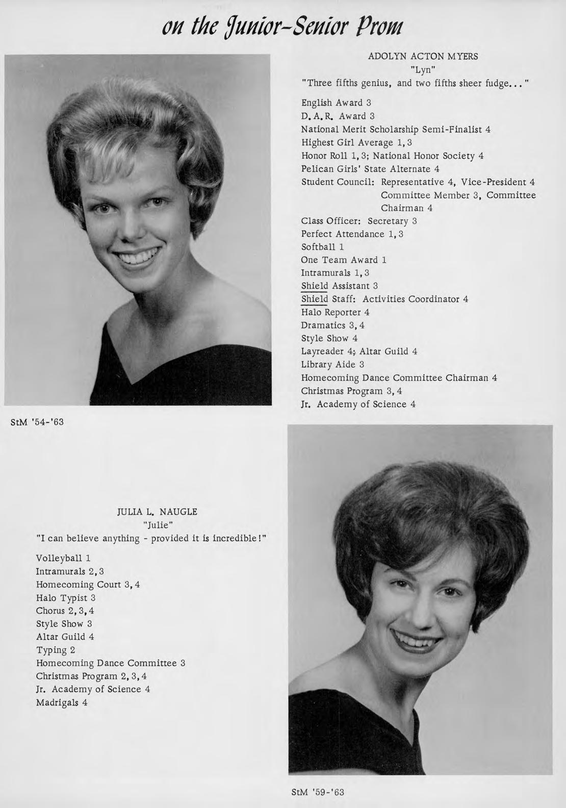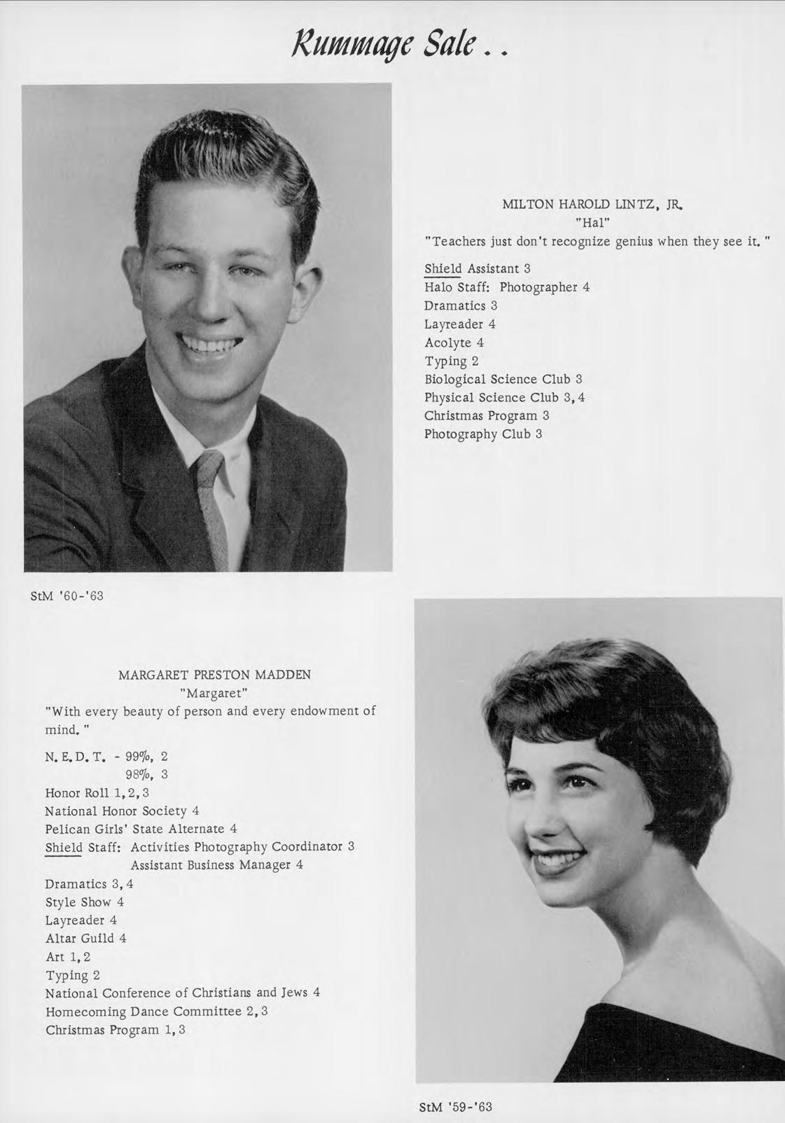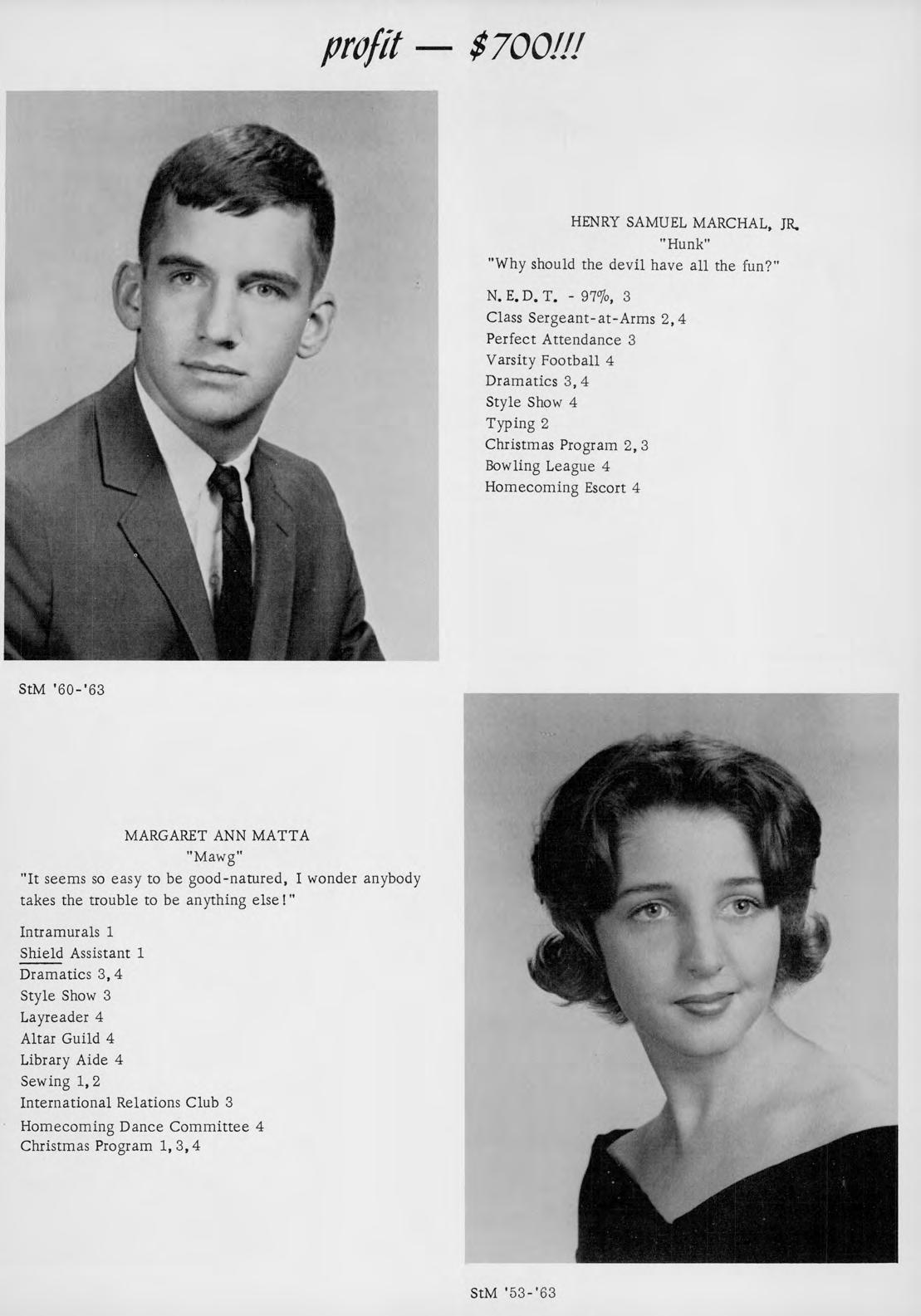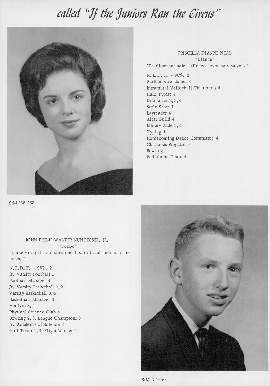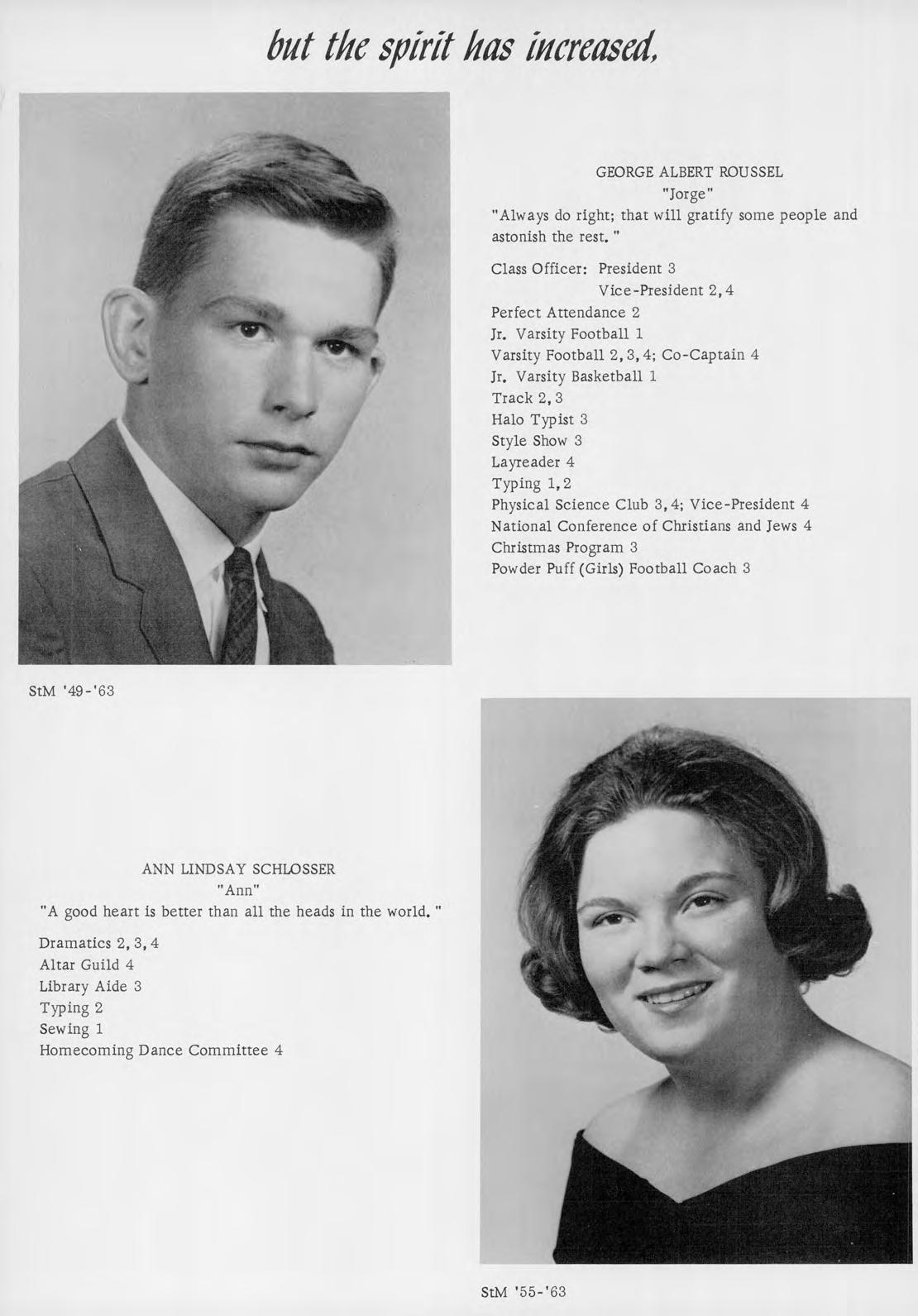 In order to help its students form well-rounded personalities, St. Martin's combines a knowledge of our cultural heritage with the enjoyment of day-to-day experiences. Recognizing these two aspects, the Shield staff endeavors to present both the serious and the light-hearted sides of life in the theme of this yearbook. The statues, representing our cultural heritage, present a contrast to the cartoon figures, which depict the humor and fun of school life. It is hoped that when you leave St. Martin's, you will always remember the advantages of such a well-rounded curriculum; and we hope that the 1963 Shield will help you cherish these memories.