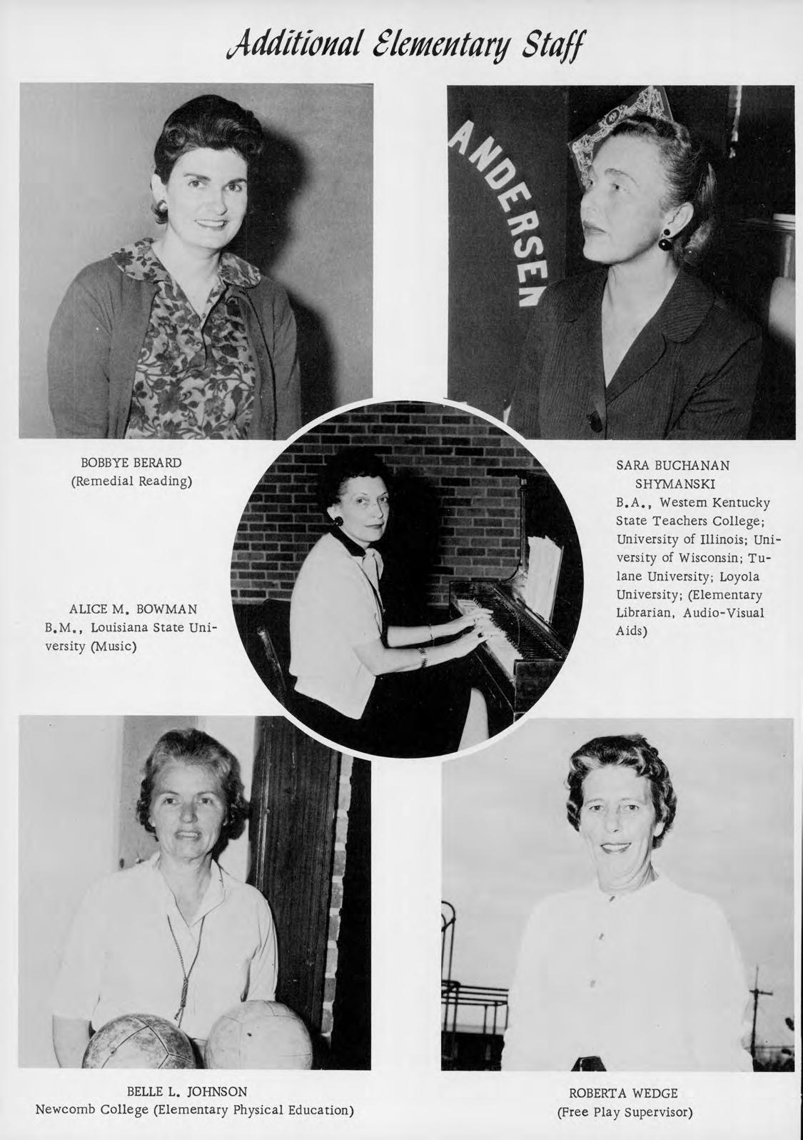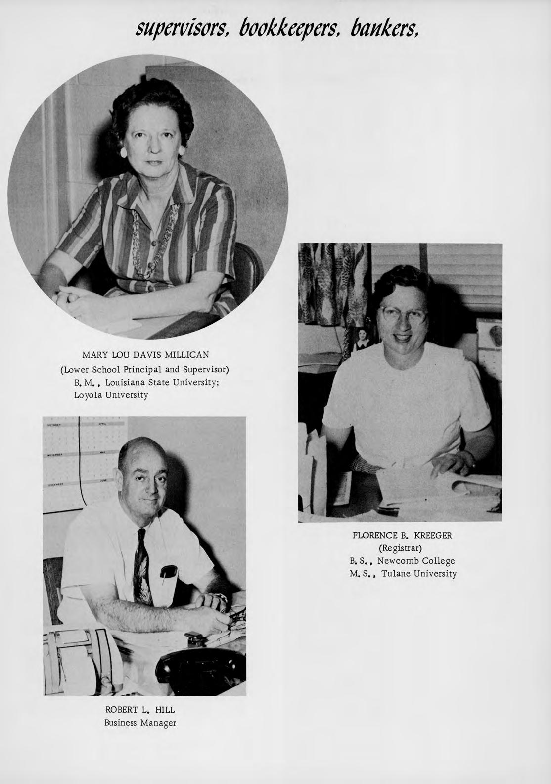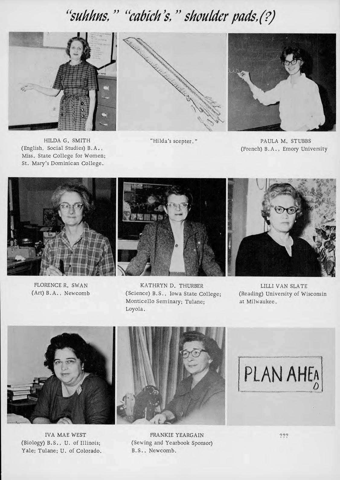 "Hilda's scepter."KATHRYN D. THURBER (Science) B.S., Iowa State College; Monticello Seminary; Tulane; Loyola. FRANKIE YEARGAIN (Sewing and Yearbook Sponsor) B.S., Newcomb. PAULA M. STUBBS (French) B. A. , Emory University LILLI VAN SLATE (Reading) University of Wisconsin at Milwaukee.