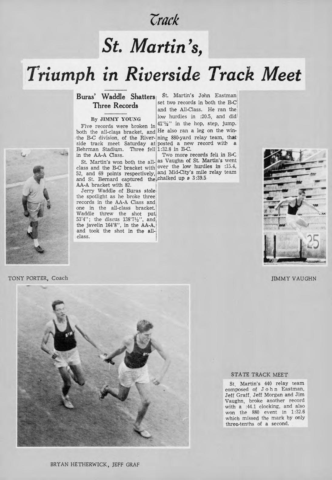 St Martin's 440 relay team com.posed of J o h n Eastman, Jeff Graff , Jeff Morgan and Jim Vaughn , broke another record with a :44. 1 clocking, and also won the 880 event in 1 :32.6 which missed the mark by only three-tenths of a second