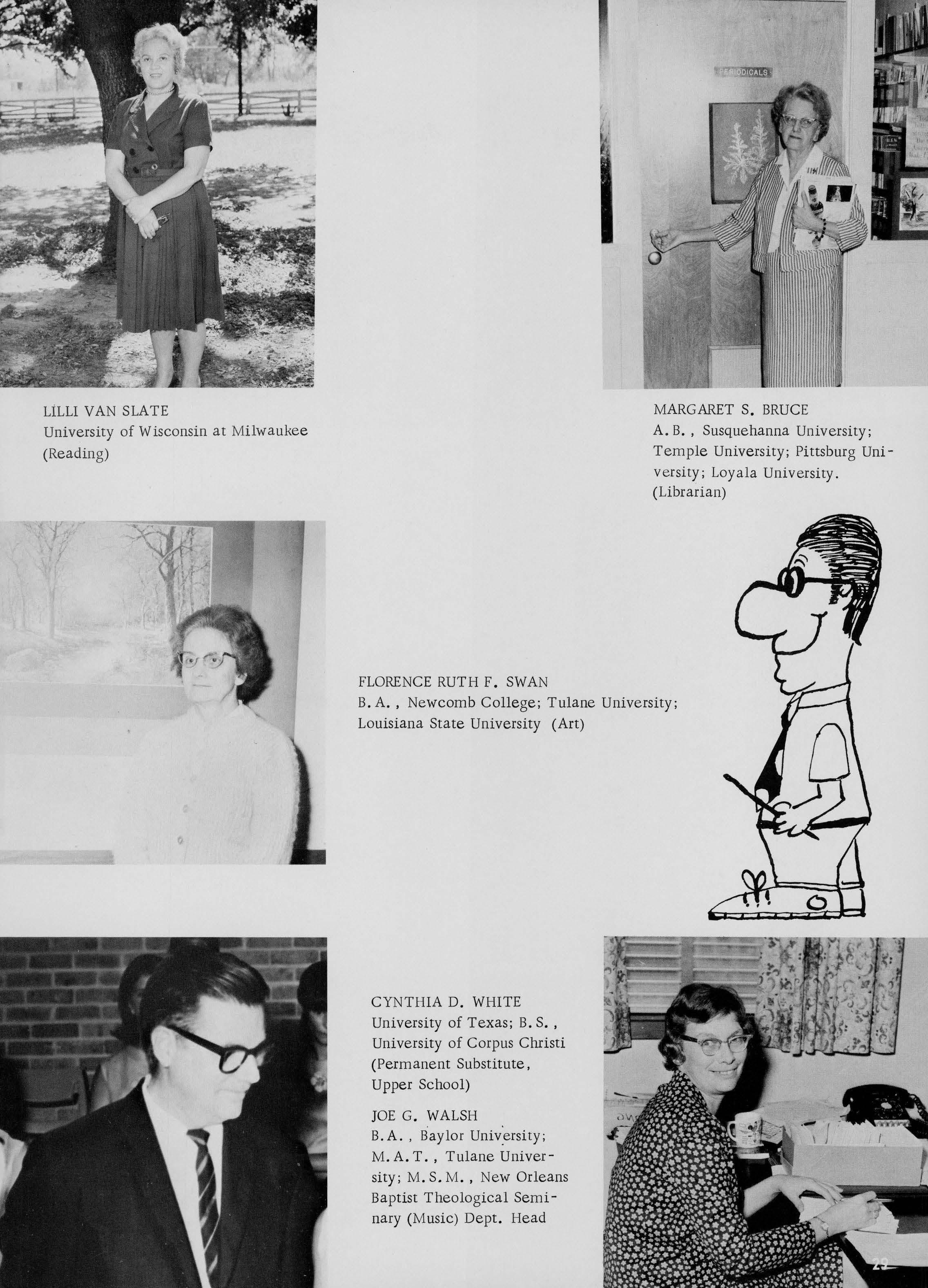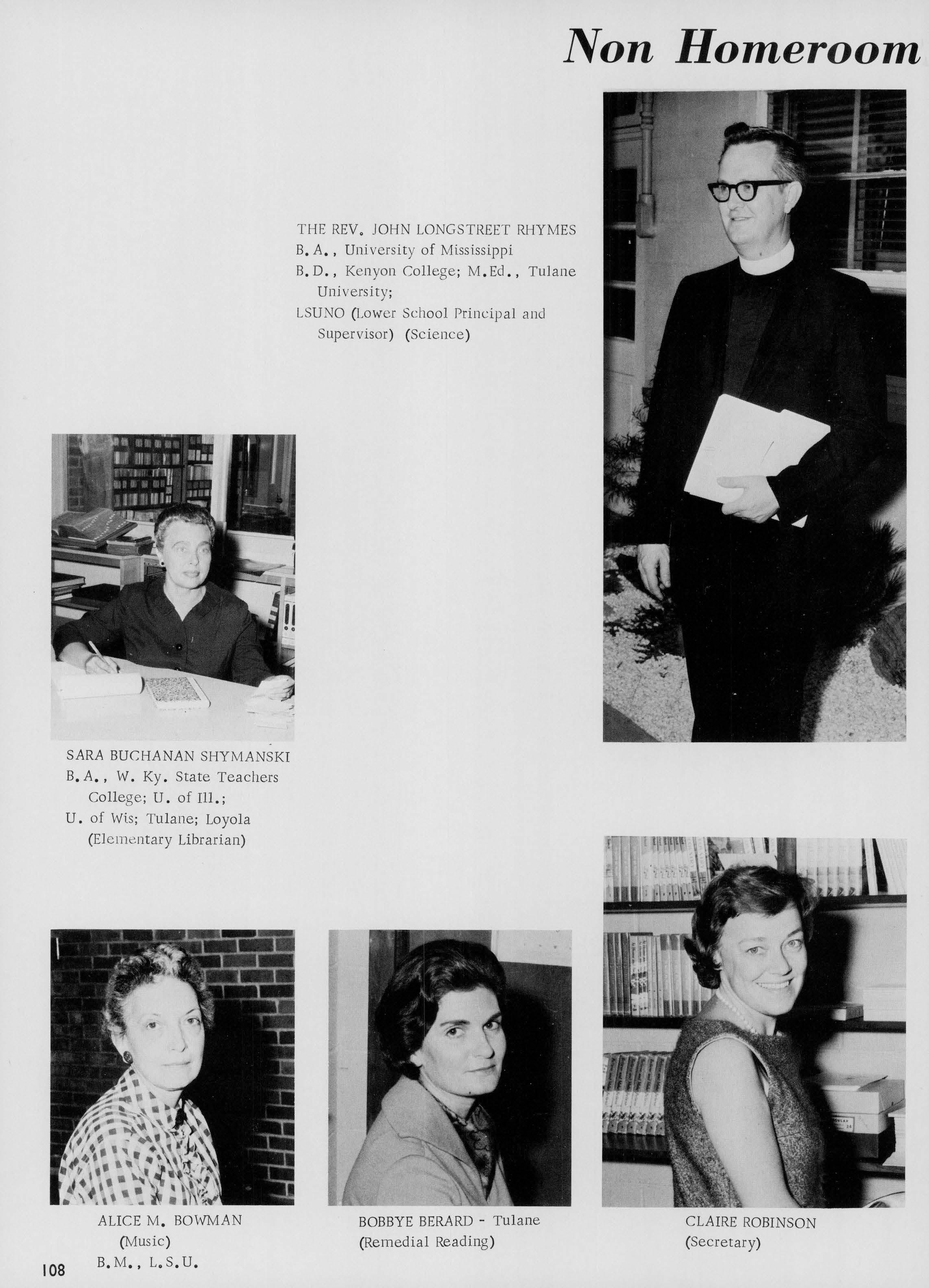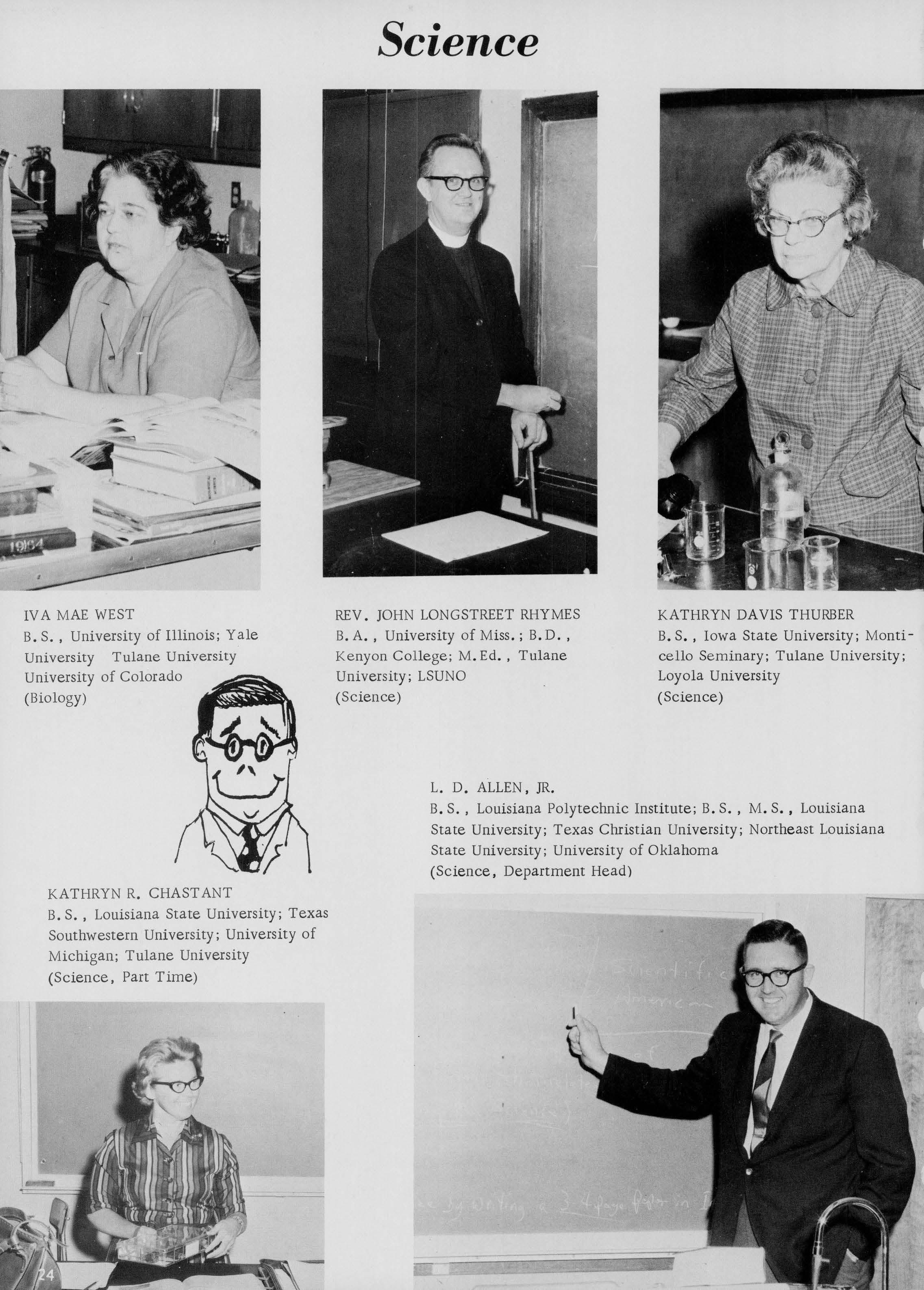 B. A., University of Miss.; B.D., Kenyon College; M. Ed. , Tulane University; LSUNO (Science)