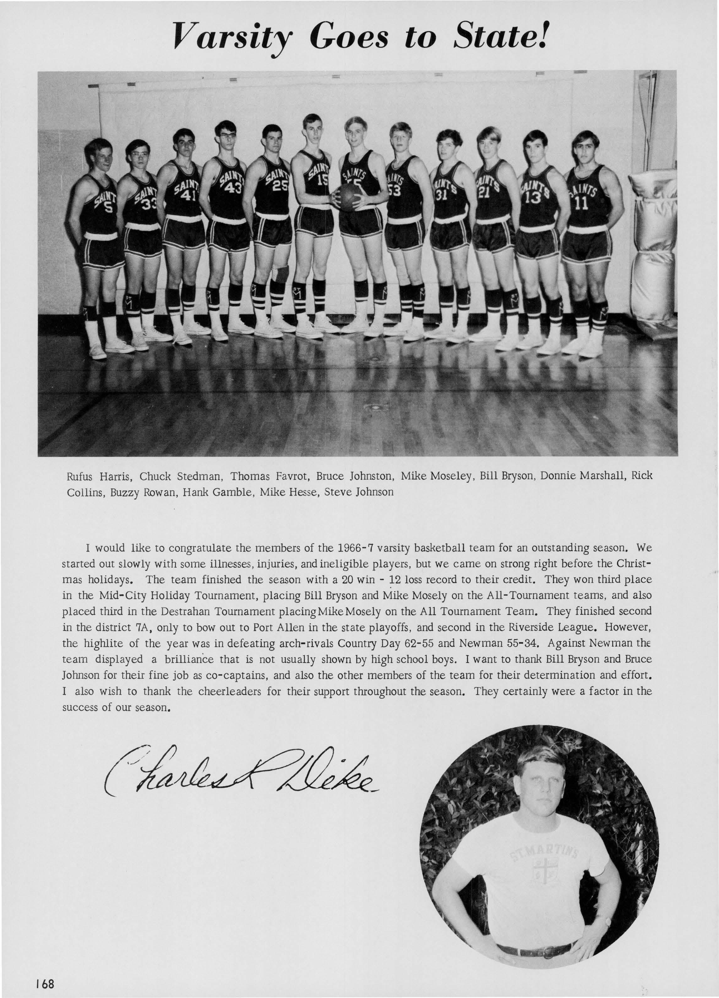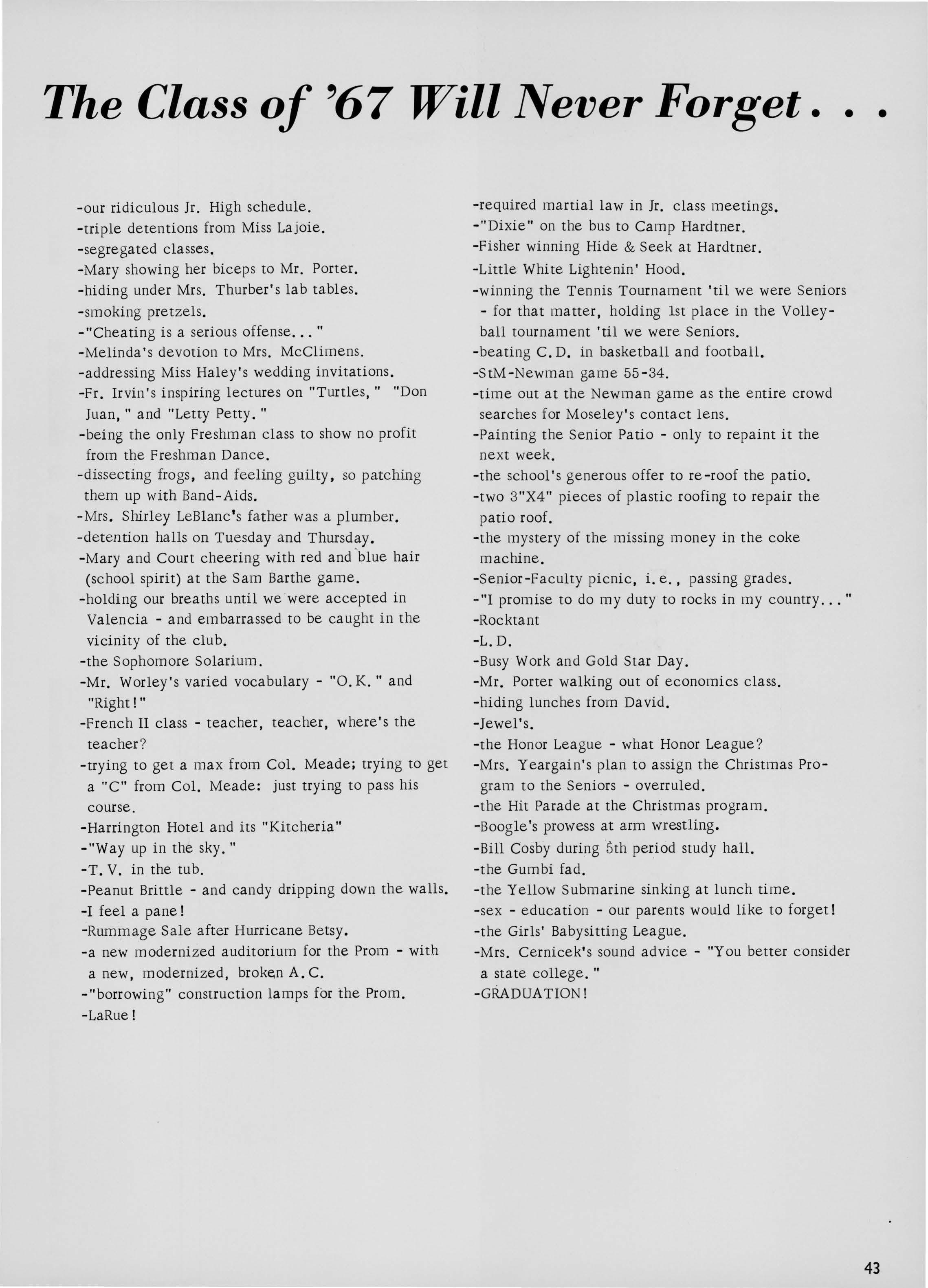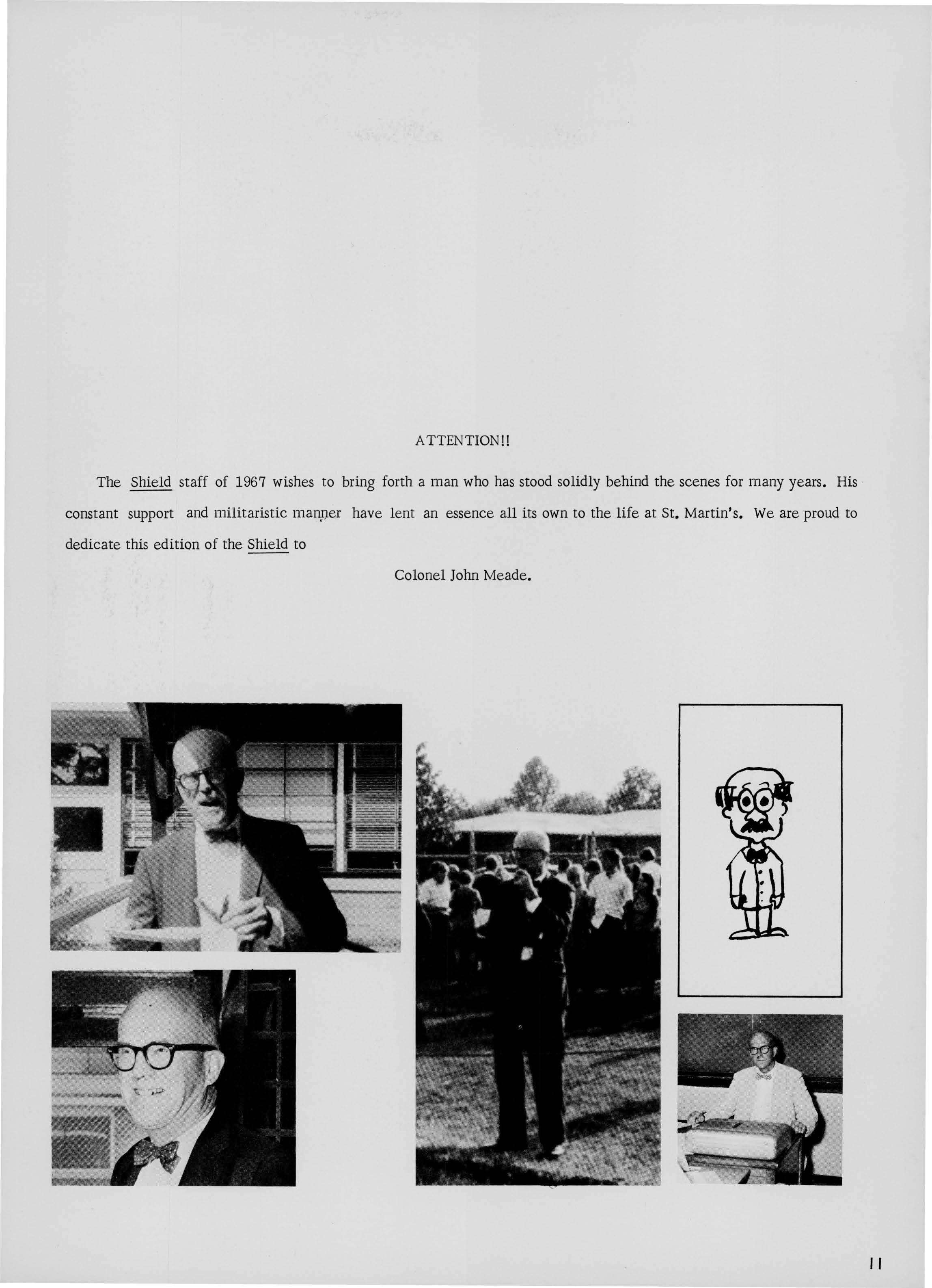 The Shield staff of 1967 wishes to bring forth a man who has stood solidly behind the scenes for many years. His · constant support and militaristic manper have lent an essence all its own to the life at St. Martin's. We are proud to dedicate this edition of the Shield to Colonel John Meade.