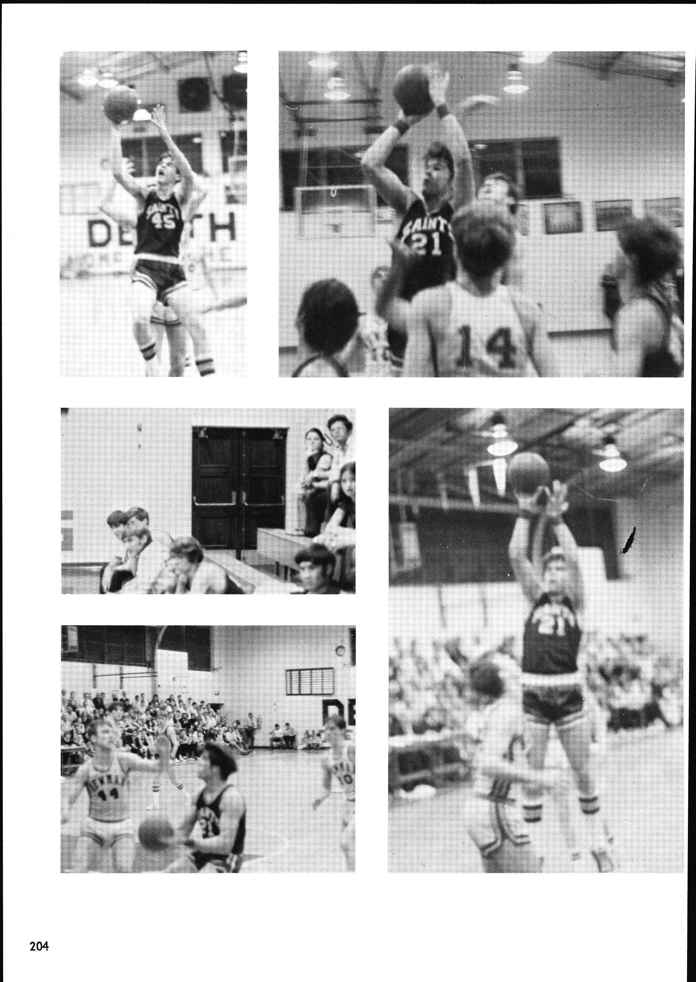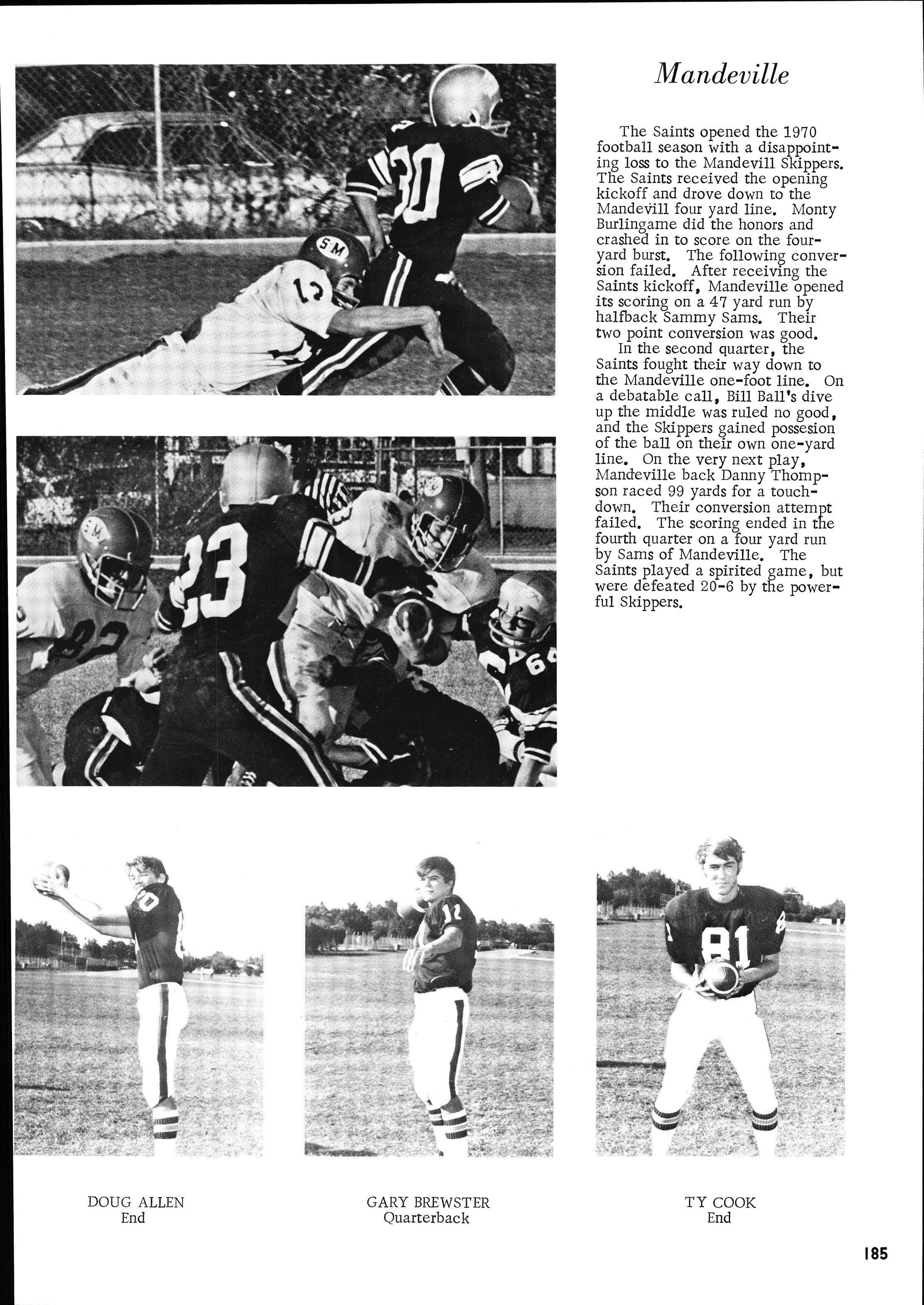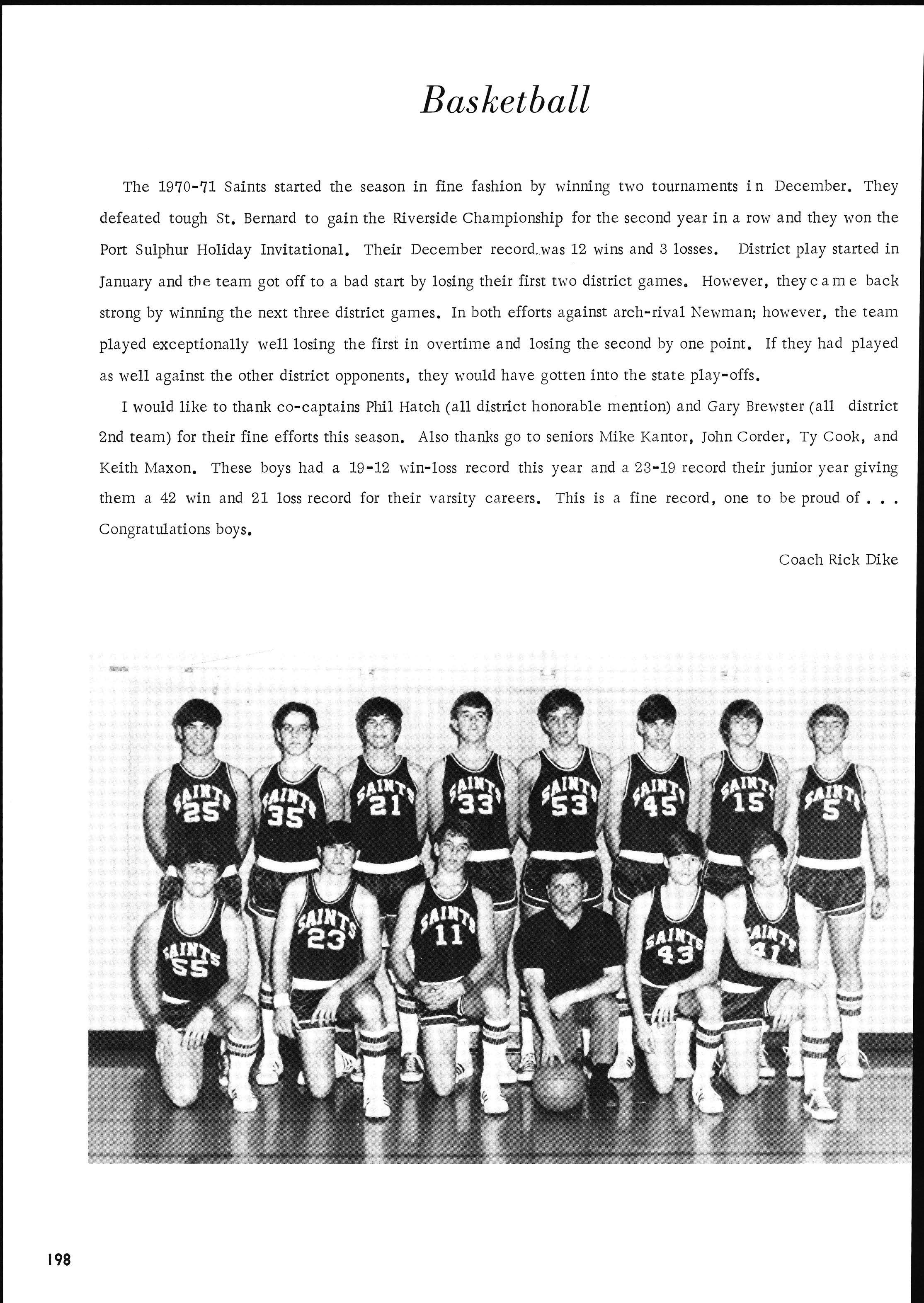 The 1970-71 Saints started the season in fine fashion by winning two tournarlents i n December. They defeated tough St. Bernard to gain the Riverside Championship for the second year in a row and they rvon the Port Sulphur Holiday Invitational. Their December record..was L2 wins and 3 losses. Disffict play started in January and the team got off to a bad start by iosing their first two district games. Howevet, theycame back strong by winning the next three district games. In both efforts agairst arch-rival. Newman; however, the team played exceptionally well losing the first in overtime and losing the second by one point. If they had played as well against the other district opponentsr they would have gotten into the state play-offs.