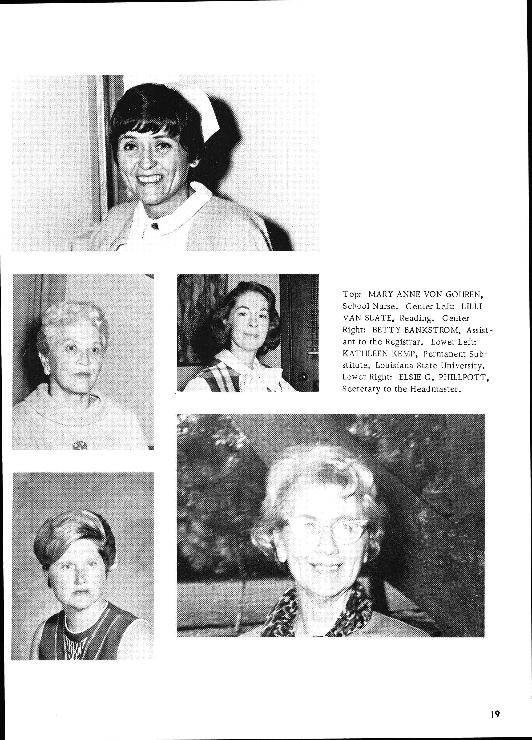 TOp: MARY ANNE VON GOHREN, S chool Nurse. C enter Left: LILLI VAN SLATE, Reading. Center Right: BETTY BANKSTROM, Assistant to the Registrar. Lower Left: KATHLEEN KEMP, Permanent Substitute, Louisiana State University. Lower Right: ELSIE C. PHILLPOTT, S ecretary to the H ead master.