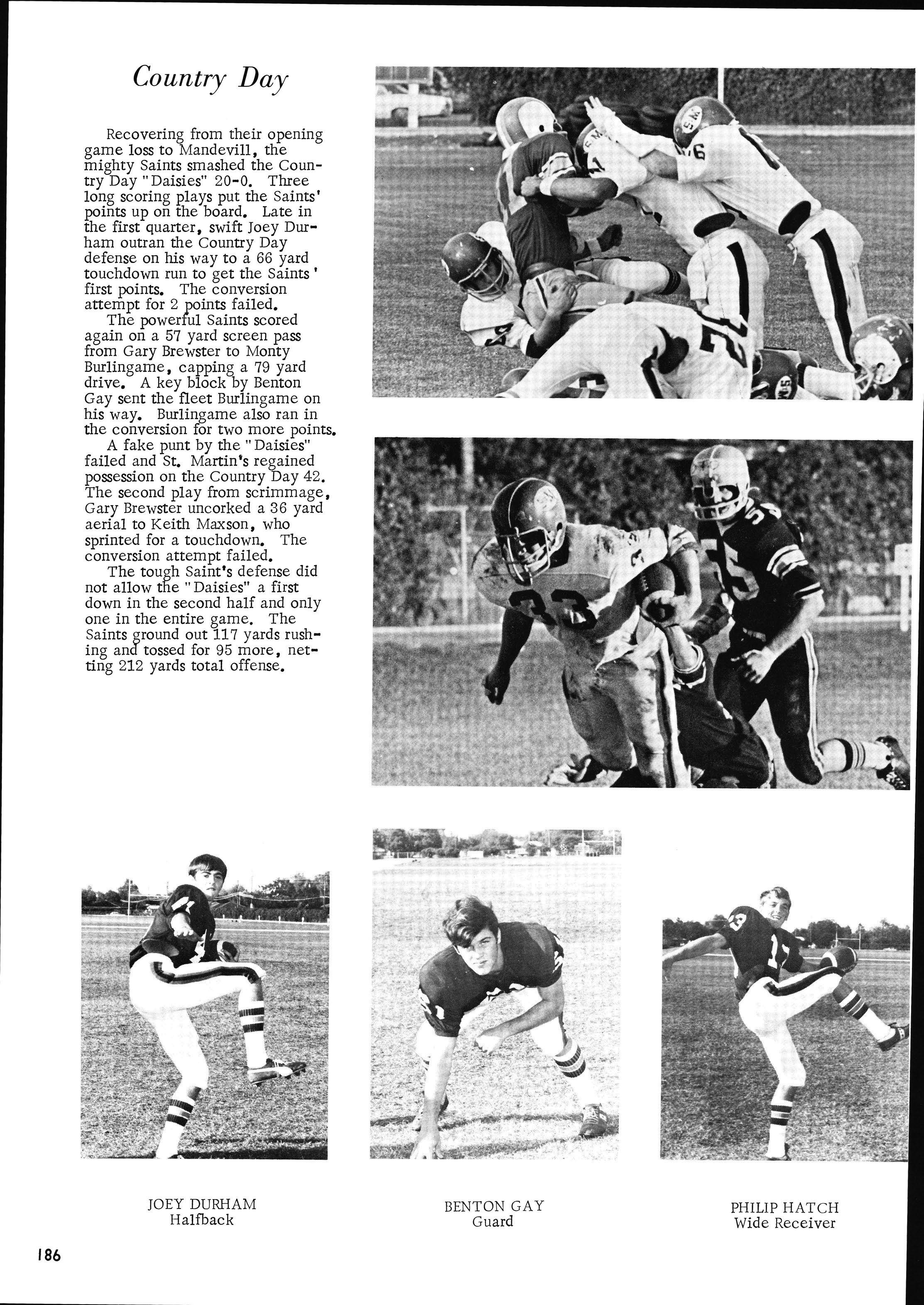 Bill Ball turned in an outstanding effort for the Saintsr offense, while Mike Sistrunk anchored the defense and gave Barthe runnem much trouble.