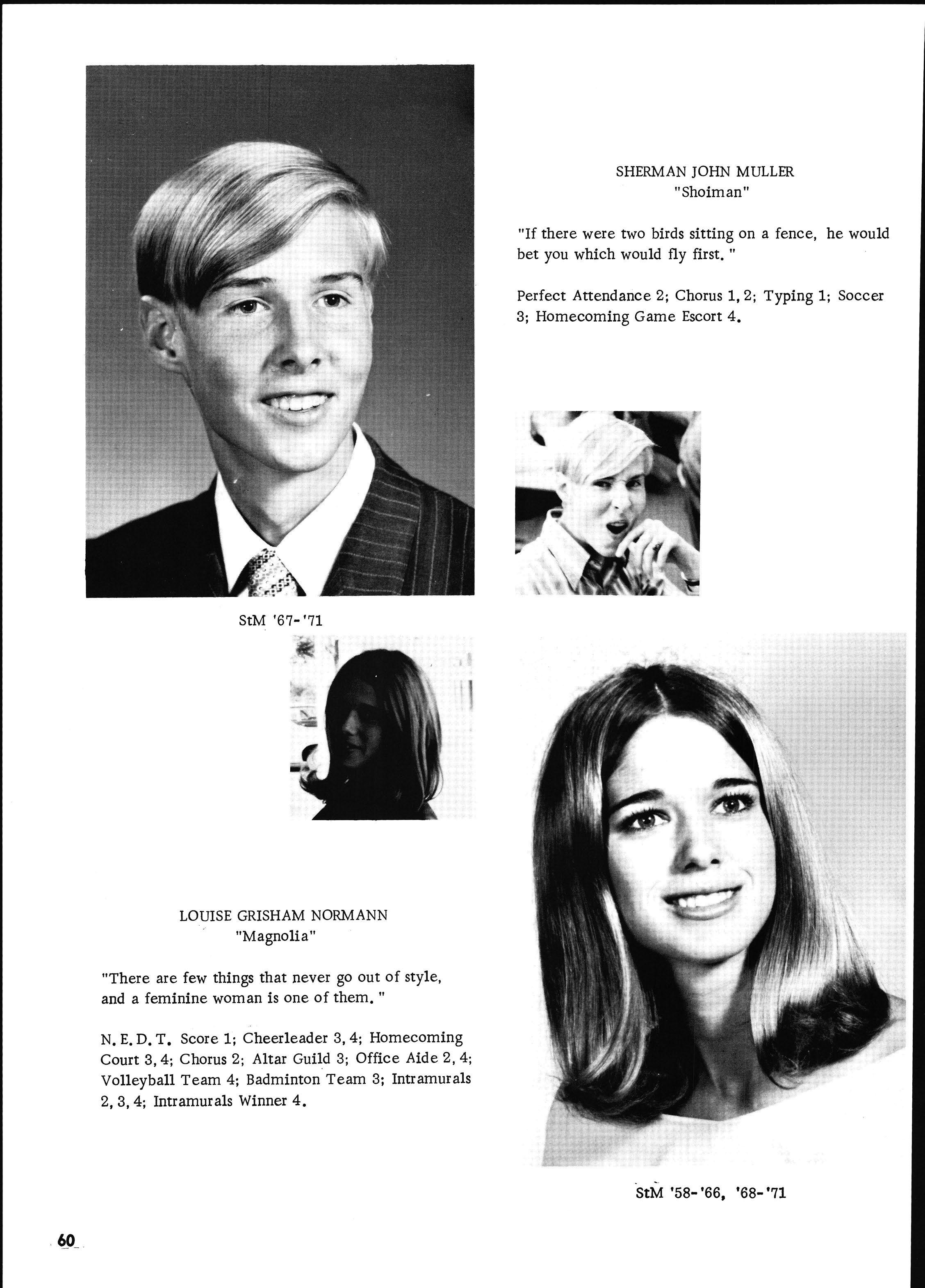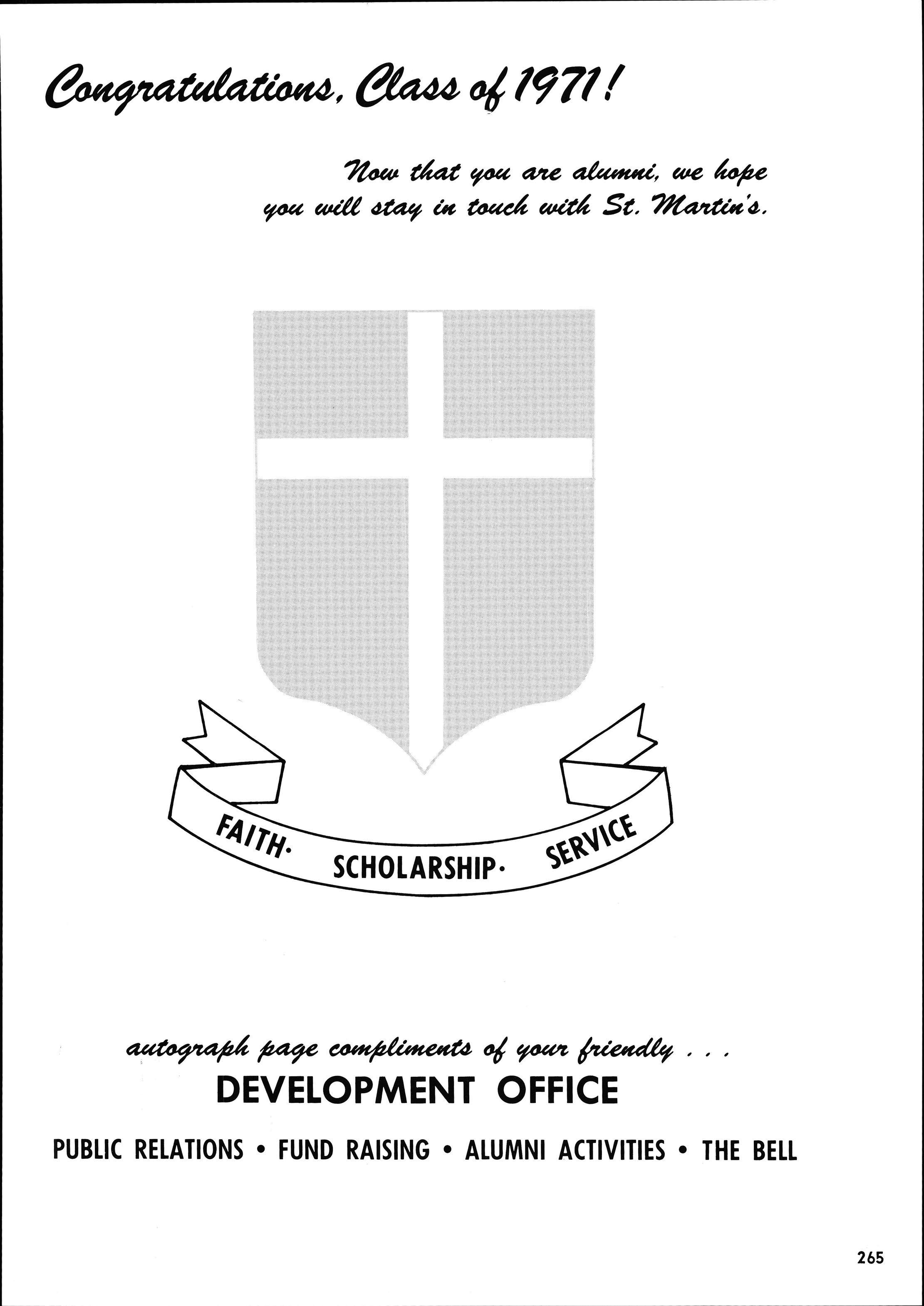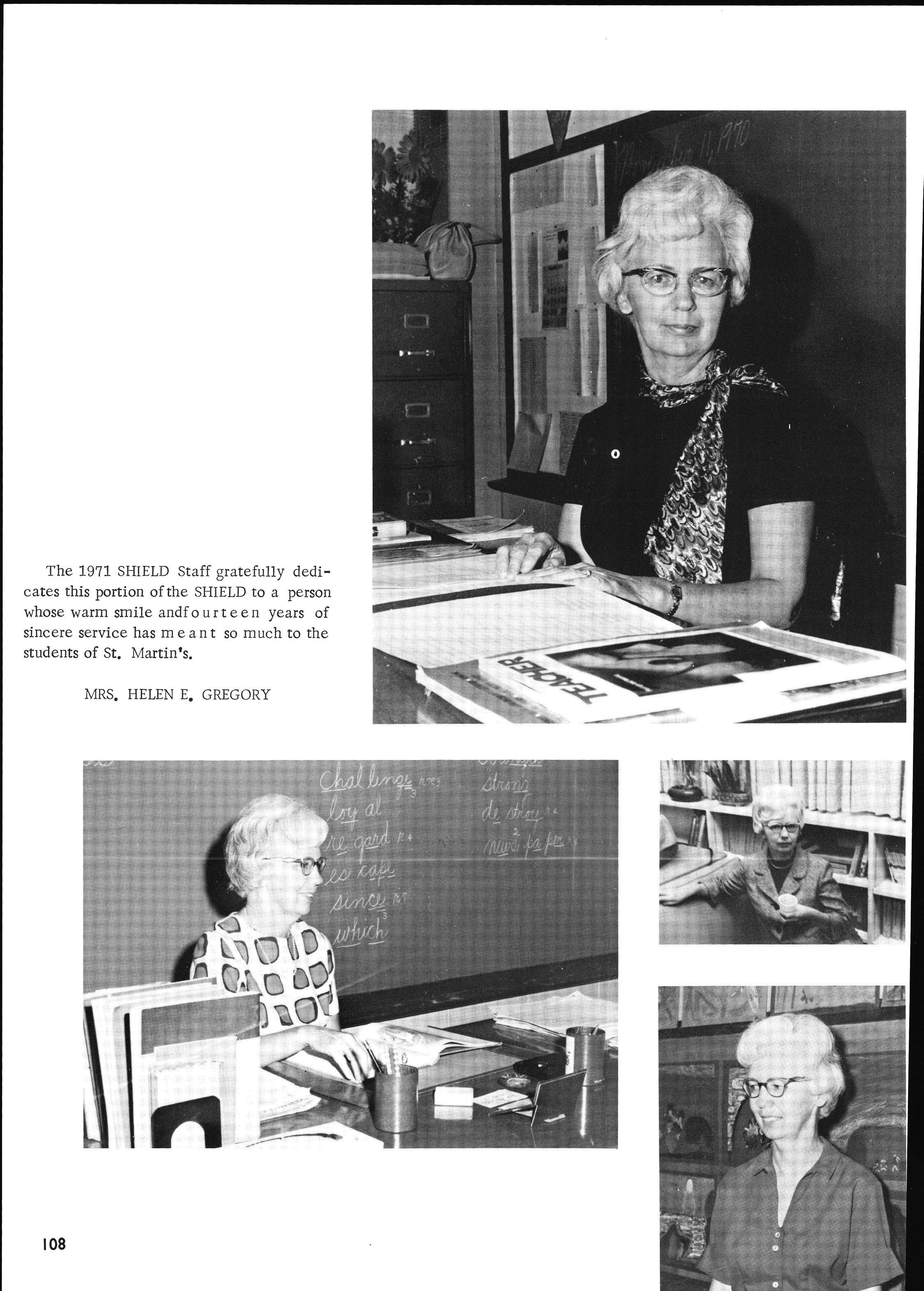 With great appreciation and admiration, the SHIELD staff proudly dedicates the L971 edition of the SHIELD to a teacher whose warm character and sincere concern for her studertts has long been a part of St. Martin's.