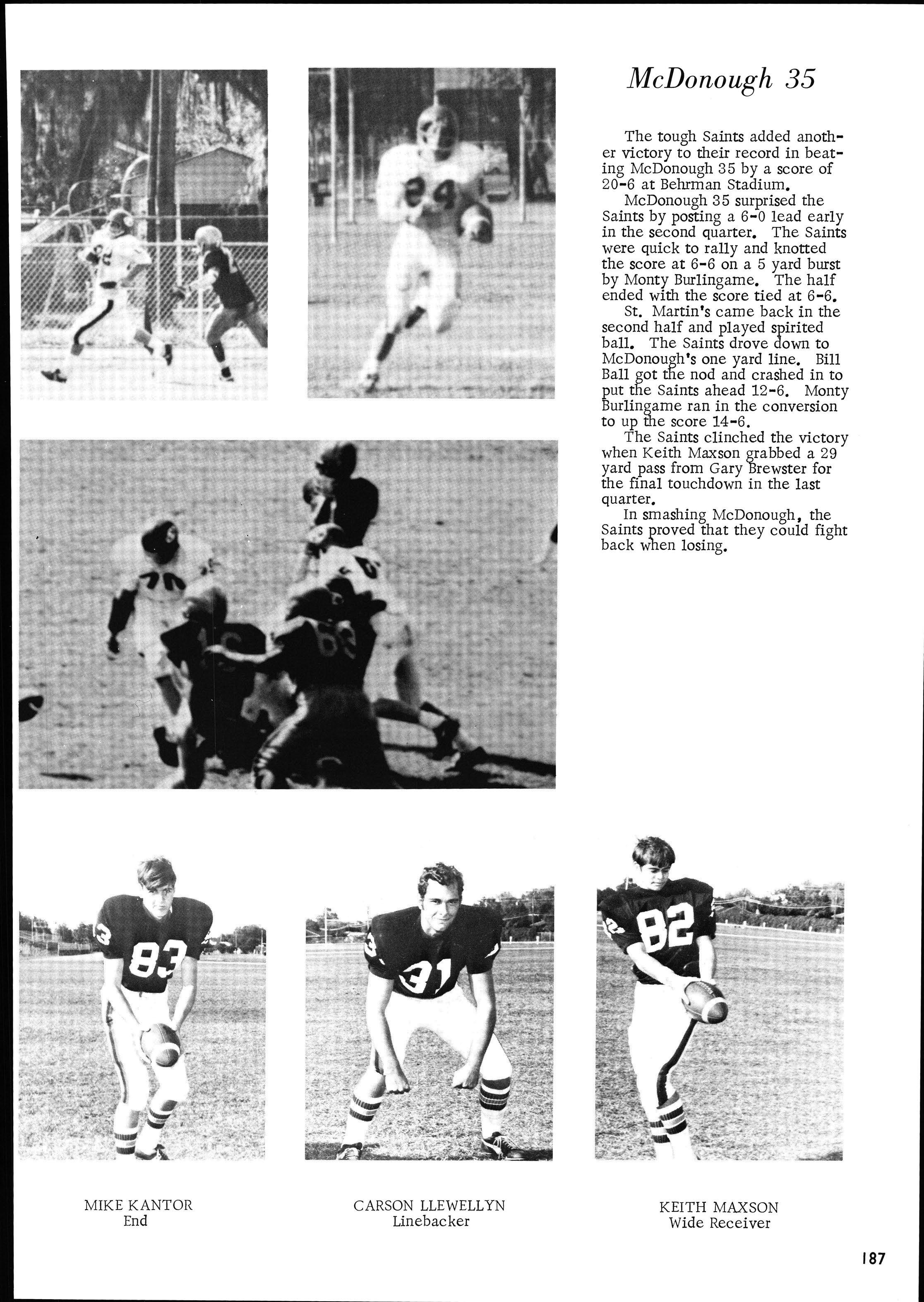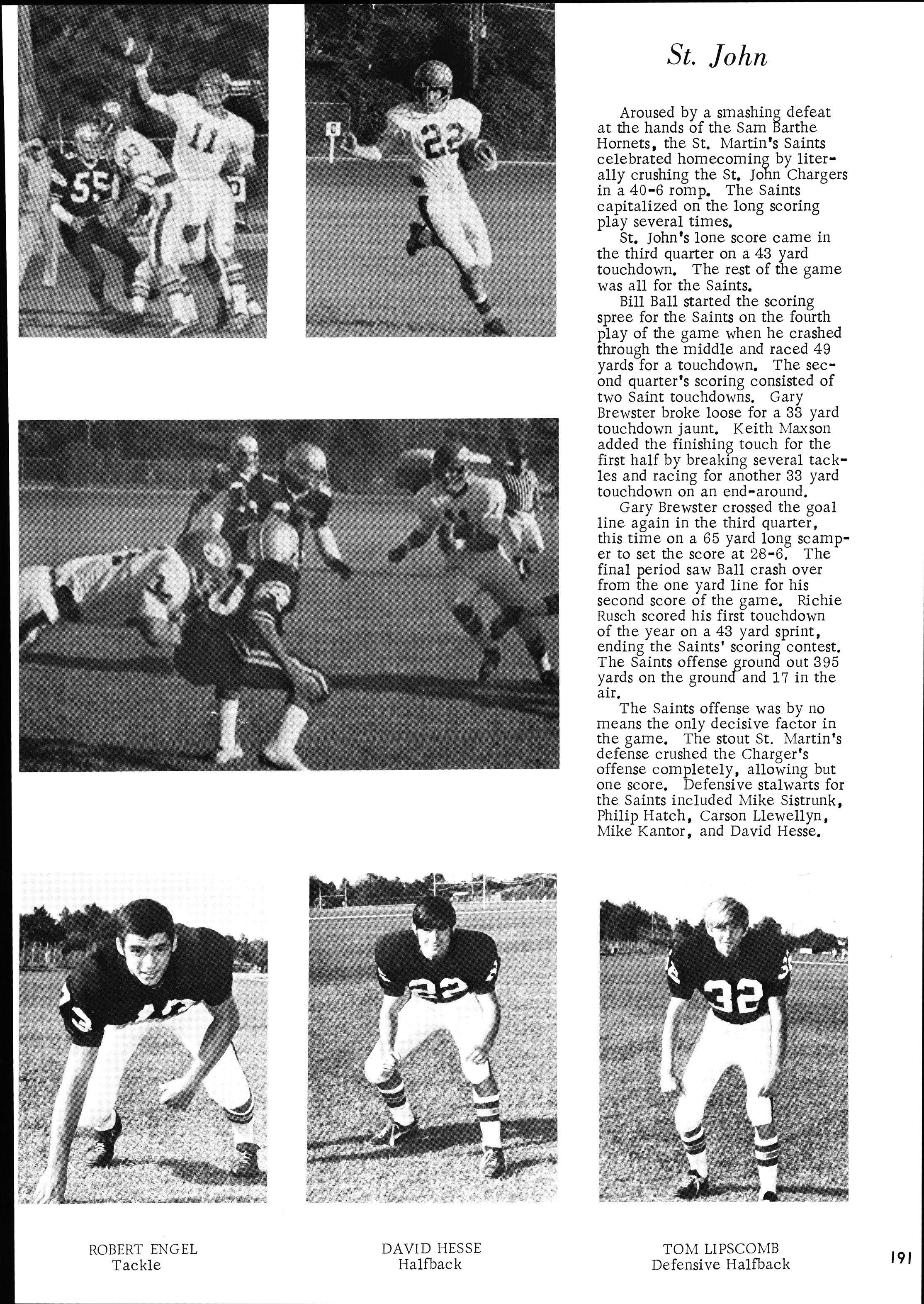 The Saints offense was by no means the only decisive factor in the galne. The stout St. Martin's defeise crushed the Charqer's offense complelely, alloiving but one score. Defensive stalwarts for the Saints included Mike Sistrunk, Philip Hatch, Carson Llewellyn, Mike Kantor, and David Hesse.