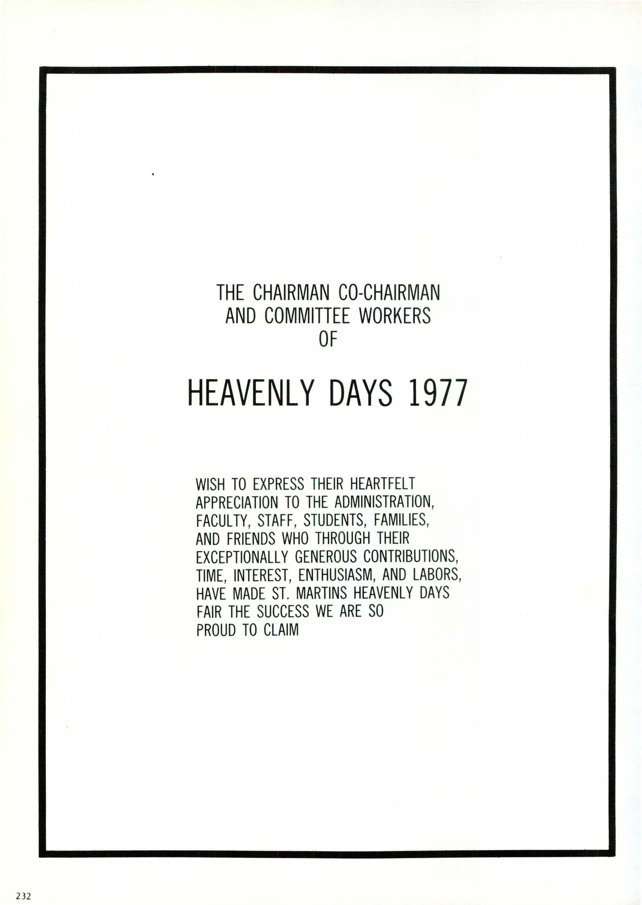 WISH TO EXPRESS THEIR HEARTFELT APPRECIATION TO THE ADMINISTRATION , FACULTY, STAFF , STUDENTS, FAMILIES , AND FRIENDS WHO THROUGH THEIR EXCEPTIONALLY GENEROUS CONTRIBUTIONS , TIME , INTEREST , ENTHUSIASM, AND LABORS , HAVE MADE ST . MARTINS HEAVENLY DAYS FAIR THE SUCCESS WE ARE SO PROUD TO CLAIM