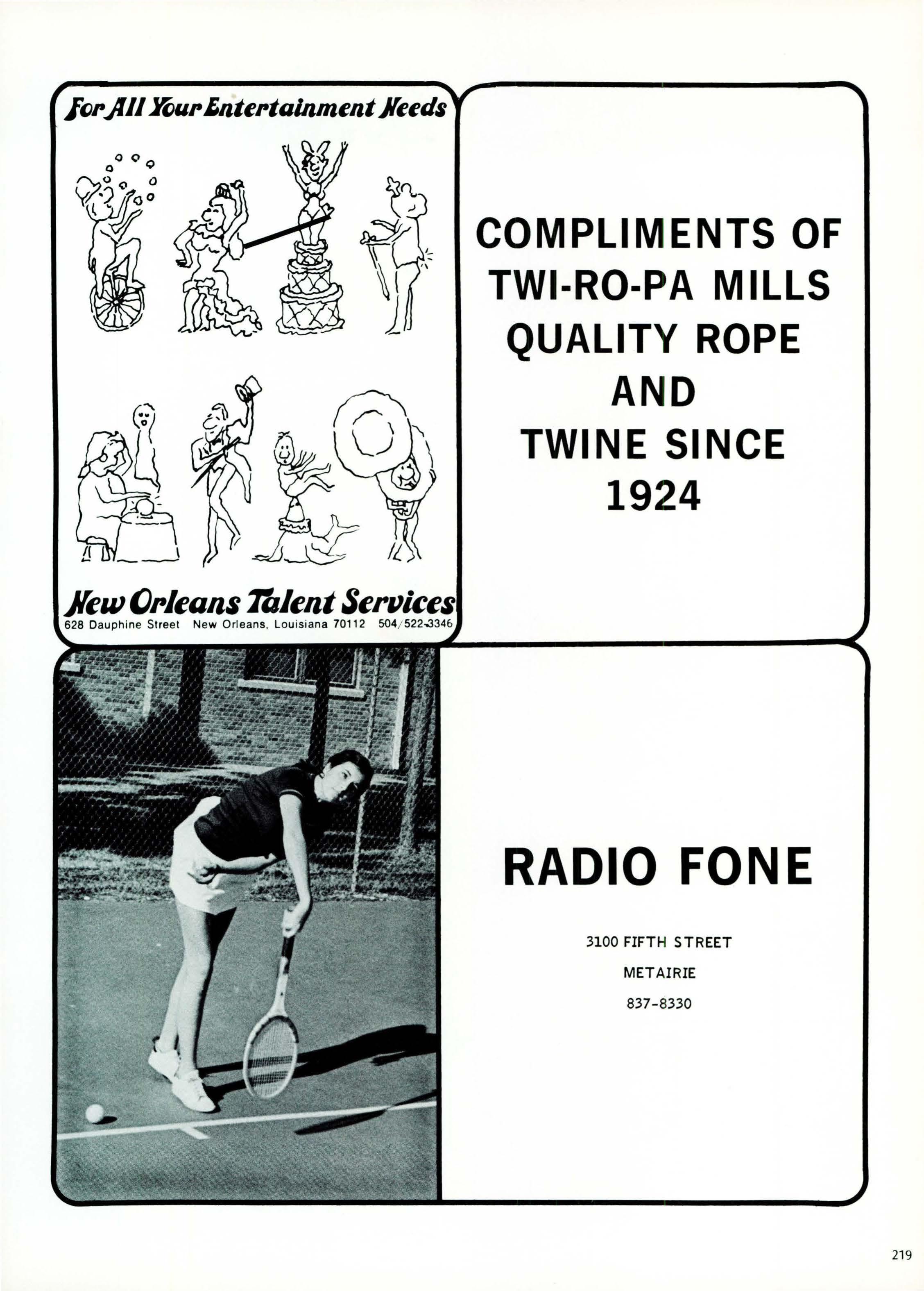 NatiM I Merit Sem -Finalist 4; Pelican State Rep e; ntative 3,; lass Pre£id,ent 3; U. V. Football 1; Varsity Football 2, 3, 4; J.V. "Bas~etball 1, 2; Varsity Basketball 4; Wrestling 3; Chorus 3, ; Art 4; Dramatics 3, 4; Student Council 2; Jr.Sr. Prom Comm. 3; Favorite 4.