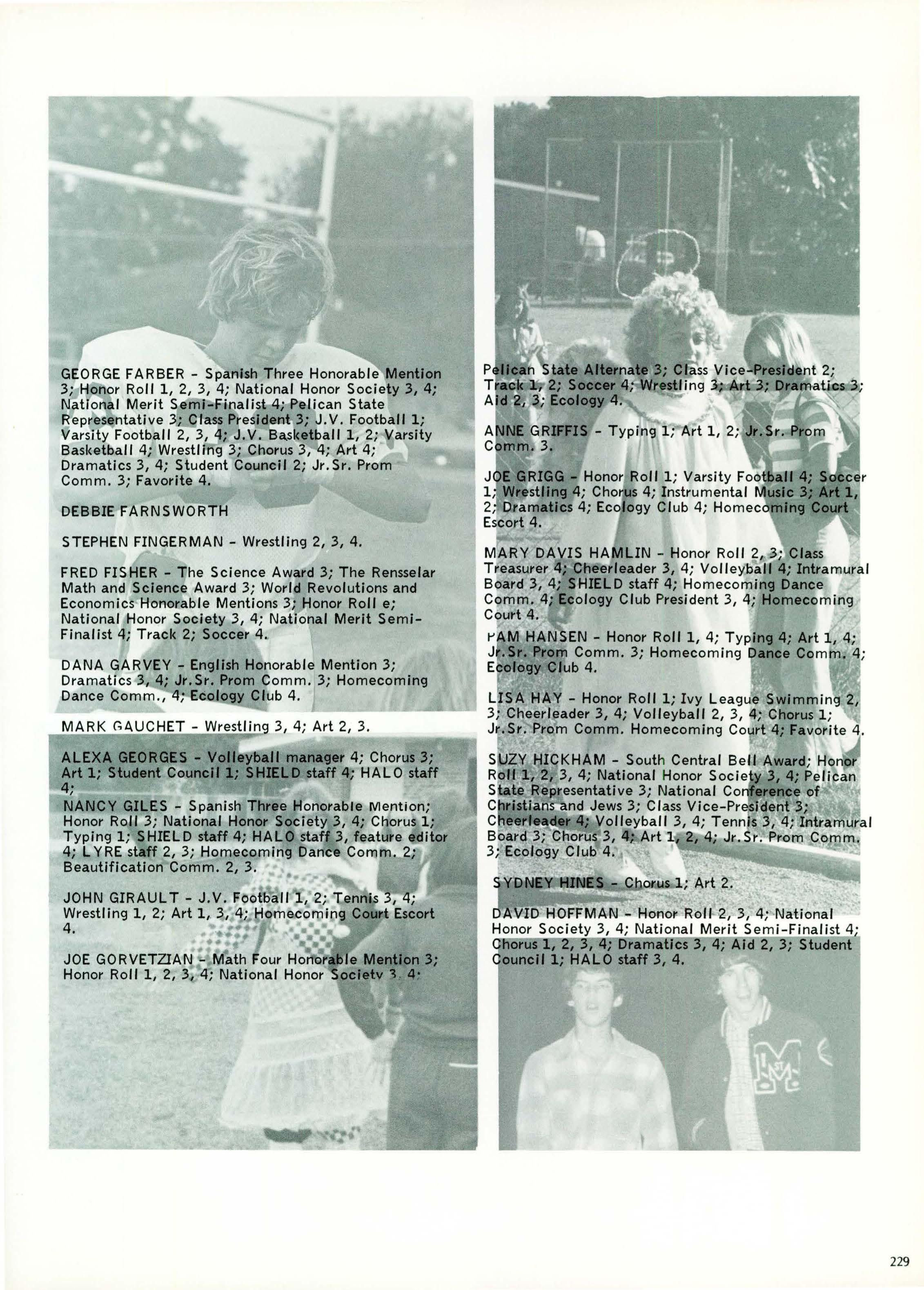 rORlE VOORS E119lish Honqrable MenU n 3; U.S. lstory 3; Science ward, li Math Four anct French onorable Mention 3; Honor Rioll 1, 2, 3, 4; National "4onor Society 3, 4; National Merit Serpl-Finalist 4; ellcan State Re entative ; Nation+I Conference Christians and J s 4; Cla Presiden 4; Class reasurer 3; Typlnt 4; Stude Council w, 3, Viceresident 4; HALO taff Feature ed. 3; anaging eel. 4;