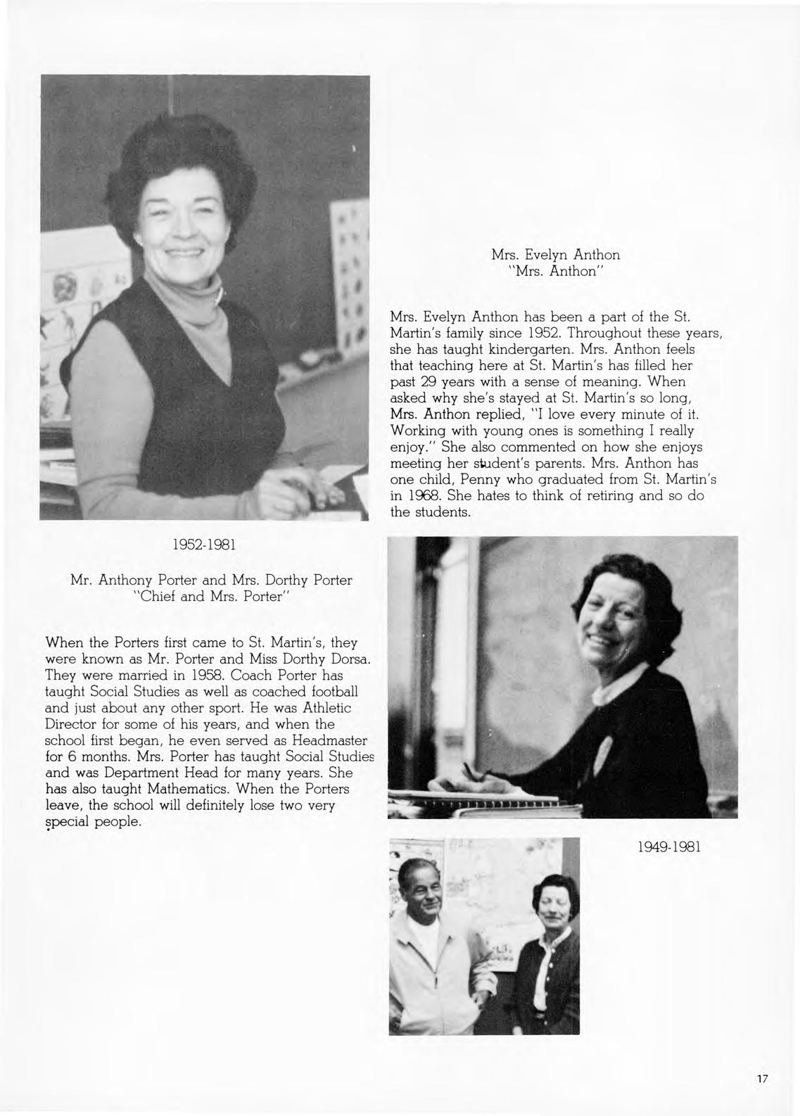 When the Porters first came to St. Martin's, they were known as Mr. Porter and Miss Dorthy Dorsa. They were married in 1958. Coach Porter has taught Social Studies as well as coac hed football and just about any o ther sport. He was Athletic Director for some of his years, and when the school first began, he even served as Headmaster for 6 months. Mrs. Porter has taught Social Studies and was Department Head for many years. She has also taught Mathematics. When the Porters leave , the school will definitely lose two very ~pecial people
