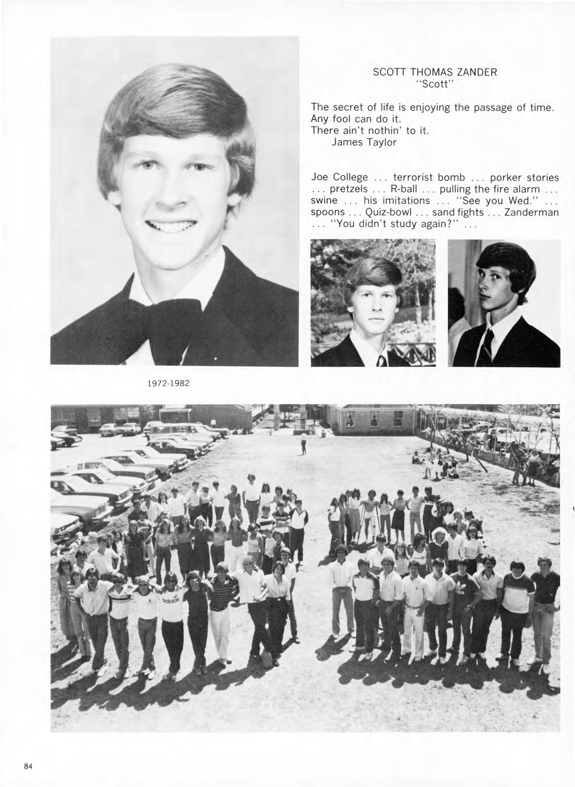 I am reminded of the time that our class took a trip across the lake as Juniors. With the help of some wonderful teachers , we finished our scheduling promptly , enabling us to have more time to discuss school related issues. Dr. T sat back and watched us handle ourselves as a community . It wasn ' t until the end of the retreat that Dr Thornton commended us, but when he did he made us feel that we were special to him He let us know that we had the potential to be a productive class . I ' m afraid that the St. Mart i n's Senior Class of 1982 is losing one of the best men that we ' ve ever had the pleasure of working with . We hope that you will en j oy him at · Episcopal Day School as much as we have here .