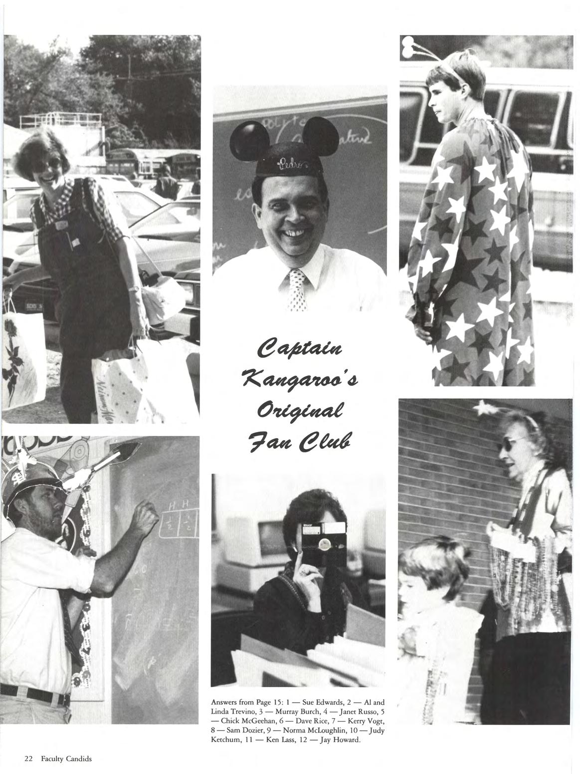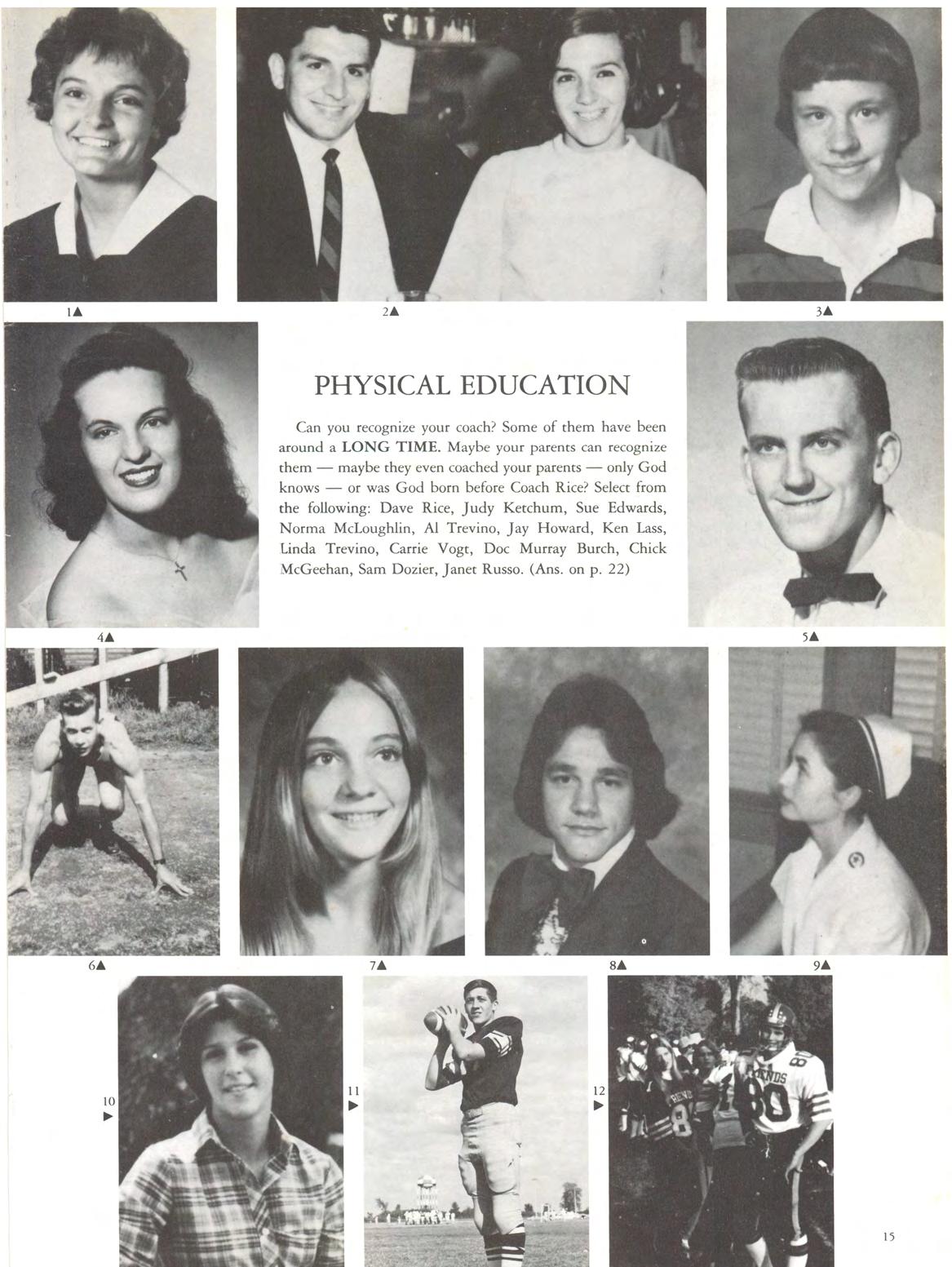 Can you recognize your coach' Some of them have been around a LONG TIME. Maybe your parents can recognize them - maybe they even coached your parents - only God knows - or was God born before Coach Rice' Select from the following: Dave Rice, Judy Ketchum, Sue Edwards, Norma Mcloughlin, Al Trevino, Jay Howard, Ken Lass, Linda Trevino, Carrie Vogt, Doc Murray Burch, Chick McGeehan, Sam Dozier, Janet Russo. (Ans. on p. 22)
