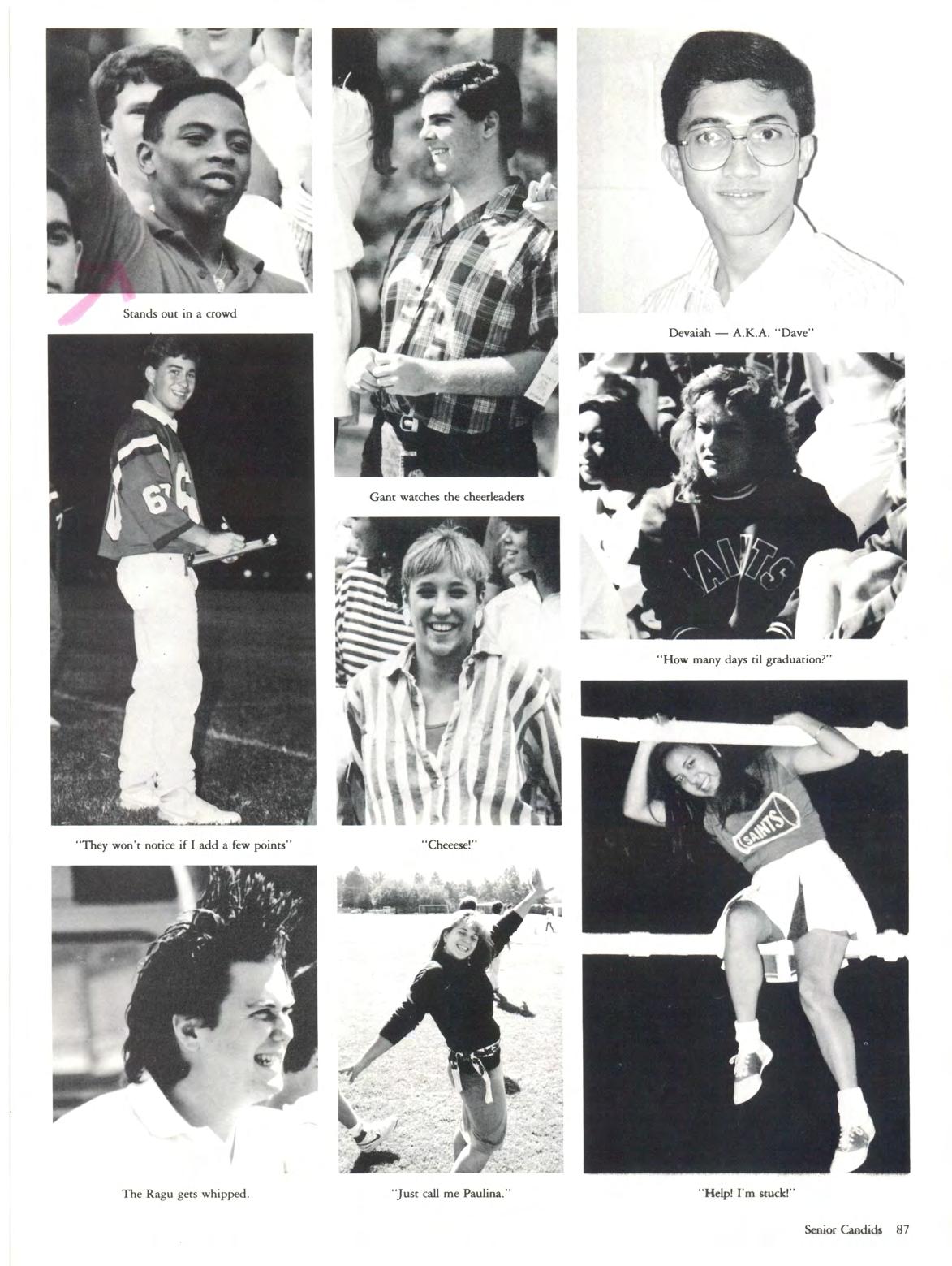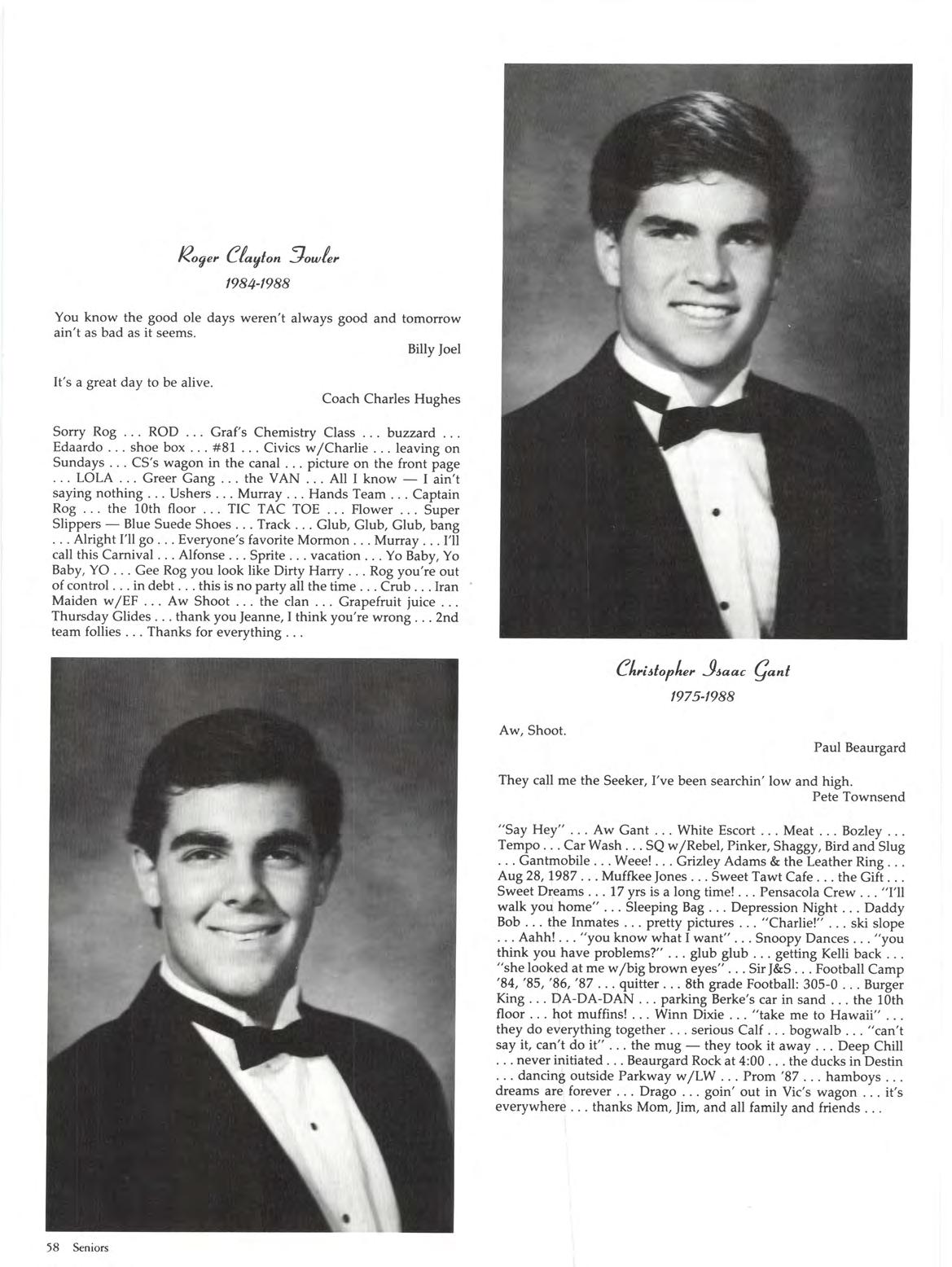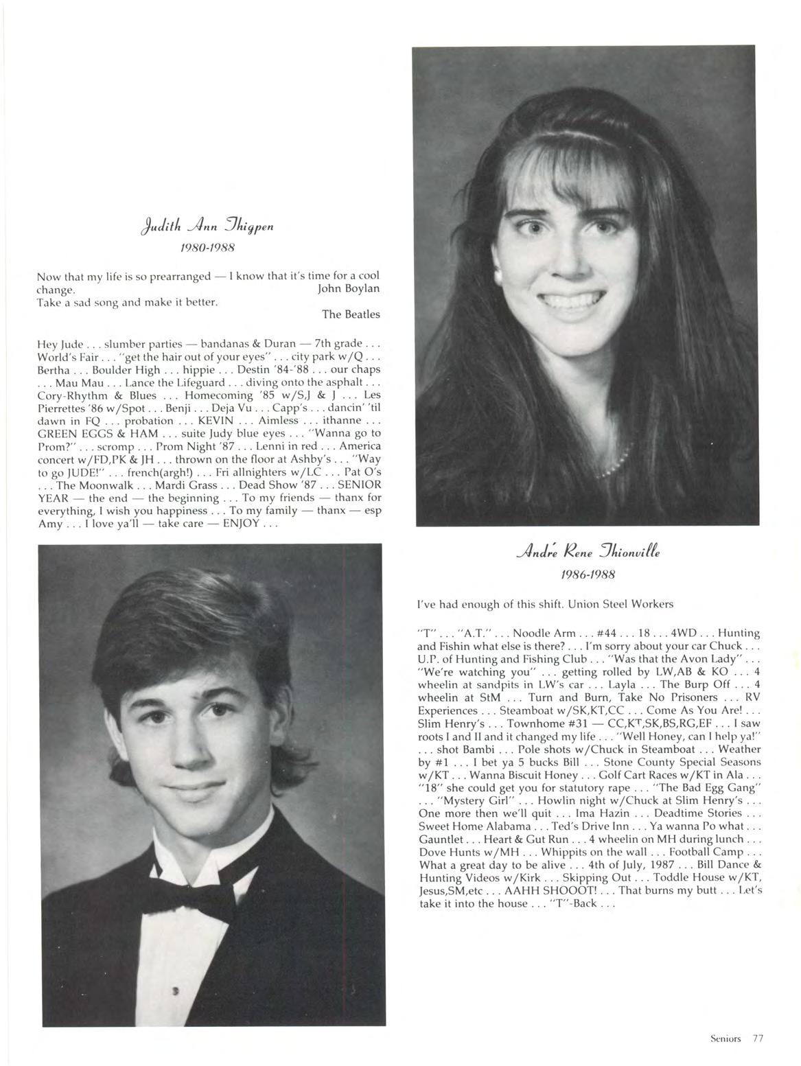 Bird Mimi #33 "I think we're gonna be in trouble" 13 yrs .' hand towel BB state champs '88? Snowman BB Captain Depression Nights McMain shot Shell credit card Club 8th gr Football, 305-0 S Quarters w /DJ, CG, LP, KM, FM " Just a littl e car sick" Pensacola Crew, we're losers 9½ weeks Greg Linky Legs jacuzzi Nights his hair